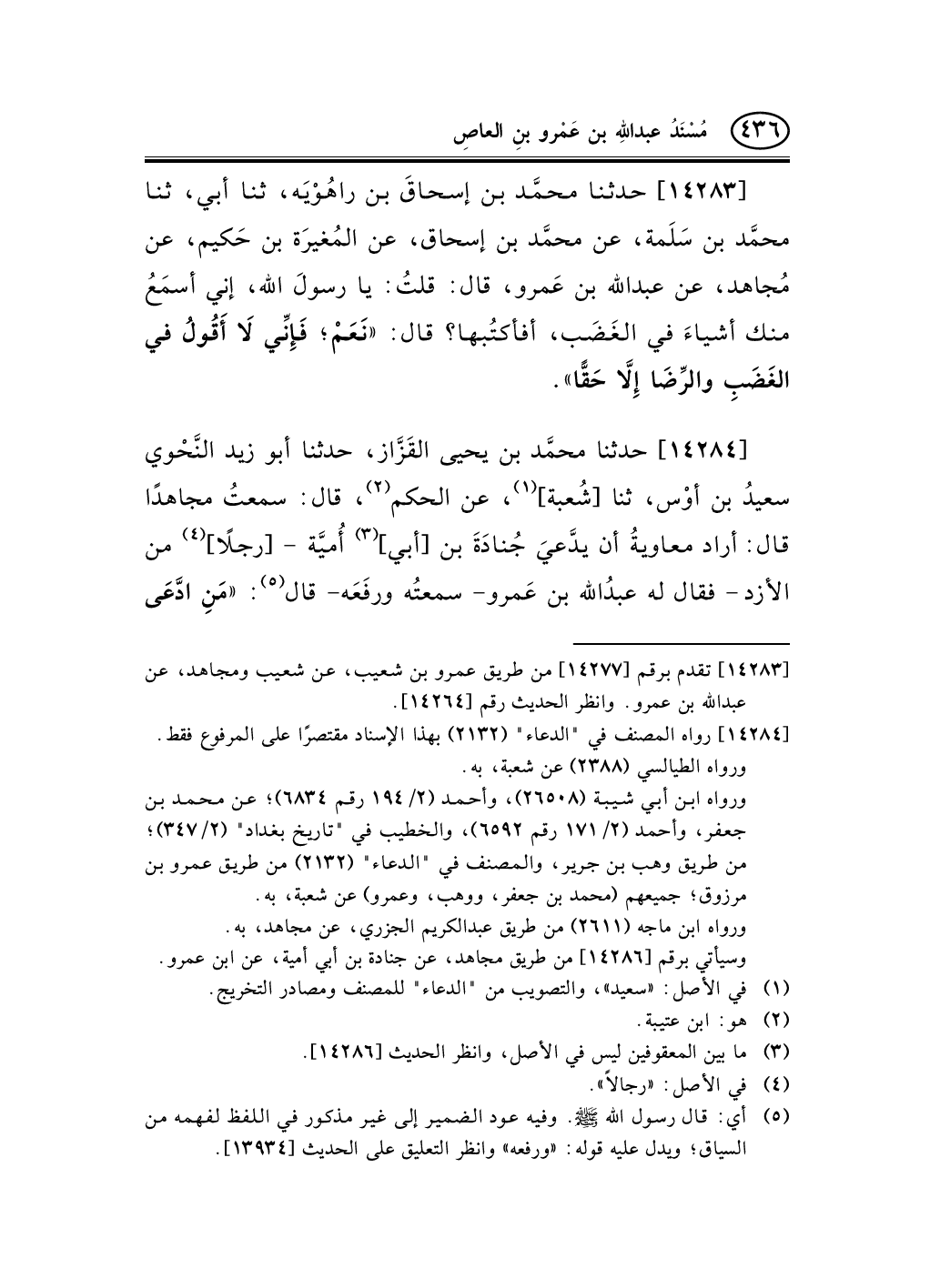 14283 - حدثنا محمَّد بن إسحاقَ بن راهُوْيَه، ثنا أبي، ثنا محمَّد بن سَلَمة، عن محمَّد بن إسحاق، عن المُغيرَة بن حَكيم، عن مُجاهد، عن عبد الله بن عَمرو، قال: قلتُ: يا رسولَ الله، إني أسمَعُ منك أشياءَ في الغَضَب، أفأكتُبها؟ قال: «نَعَمْ؛ فَإِنِّي لاَ أَقُولُ في الغَضَبِ والرِّضَا إِلاَّ حَقًّا» .