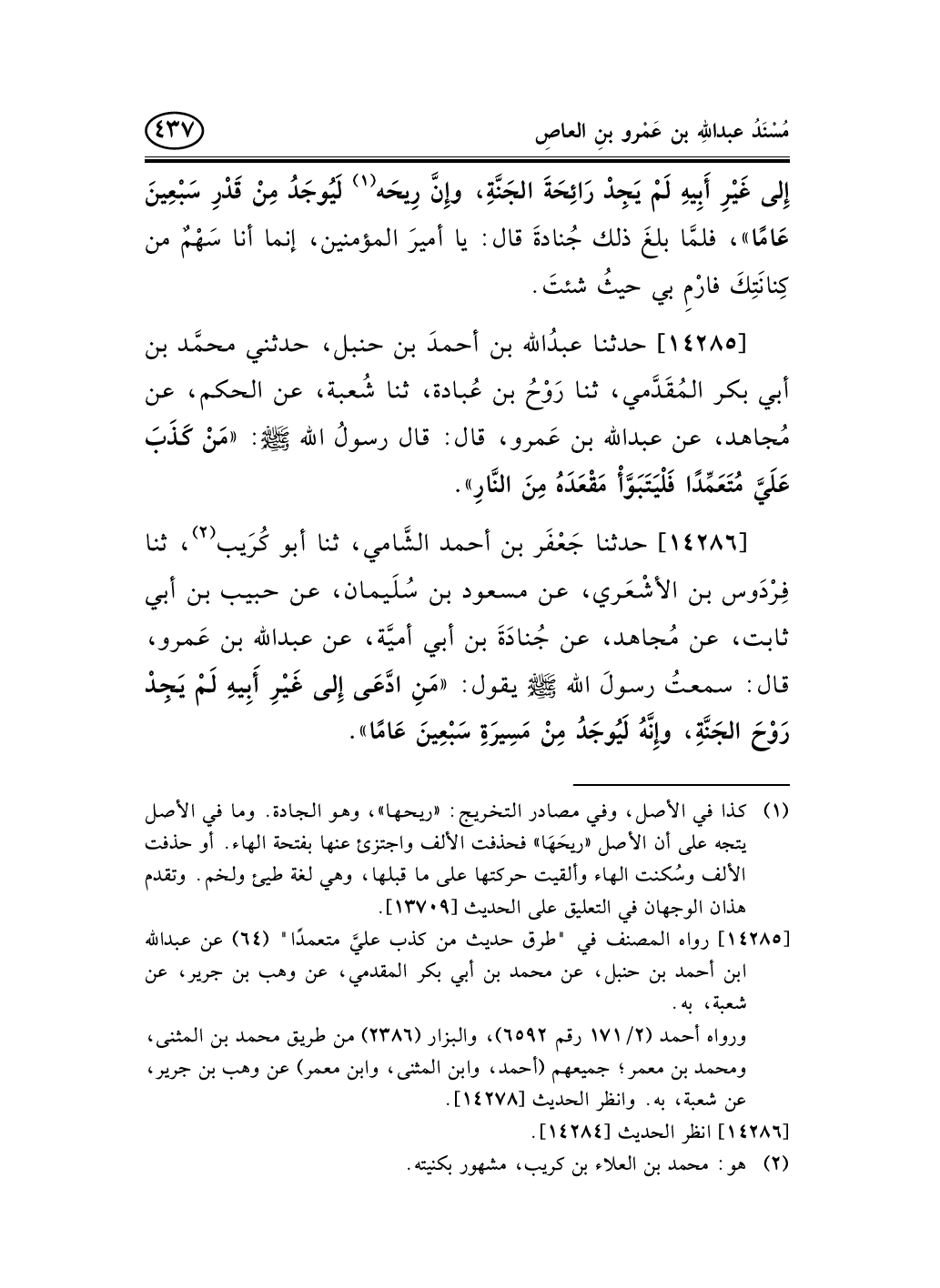 14285 - حدثنا عبدُالله بن أحمدَ بن حنبل، حدثني محمَّد بن أبي بكر المُقَدَّمي، ثنا رَوْحُ بن عُبادة، ثنا شُعبة، عن الحكم، عن مُجاهد، عن عبد الله بن عَمرو، قال: قال رسولُ الله صلى الله عليه وسلم: «مَنْ كَذَبَ عَلَيَّ مُتَعَمِّدًا فَلْيَتَبَوَّأْ مَقْعَدَهُ مِنَ النَّارِ» .