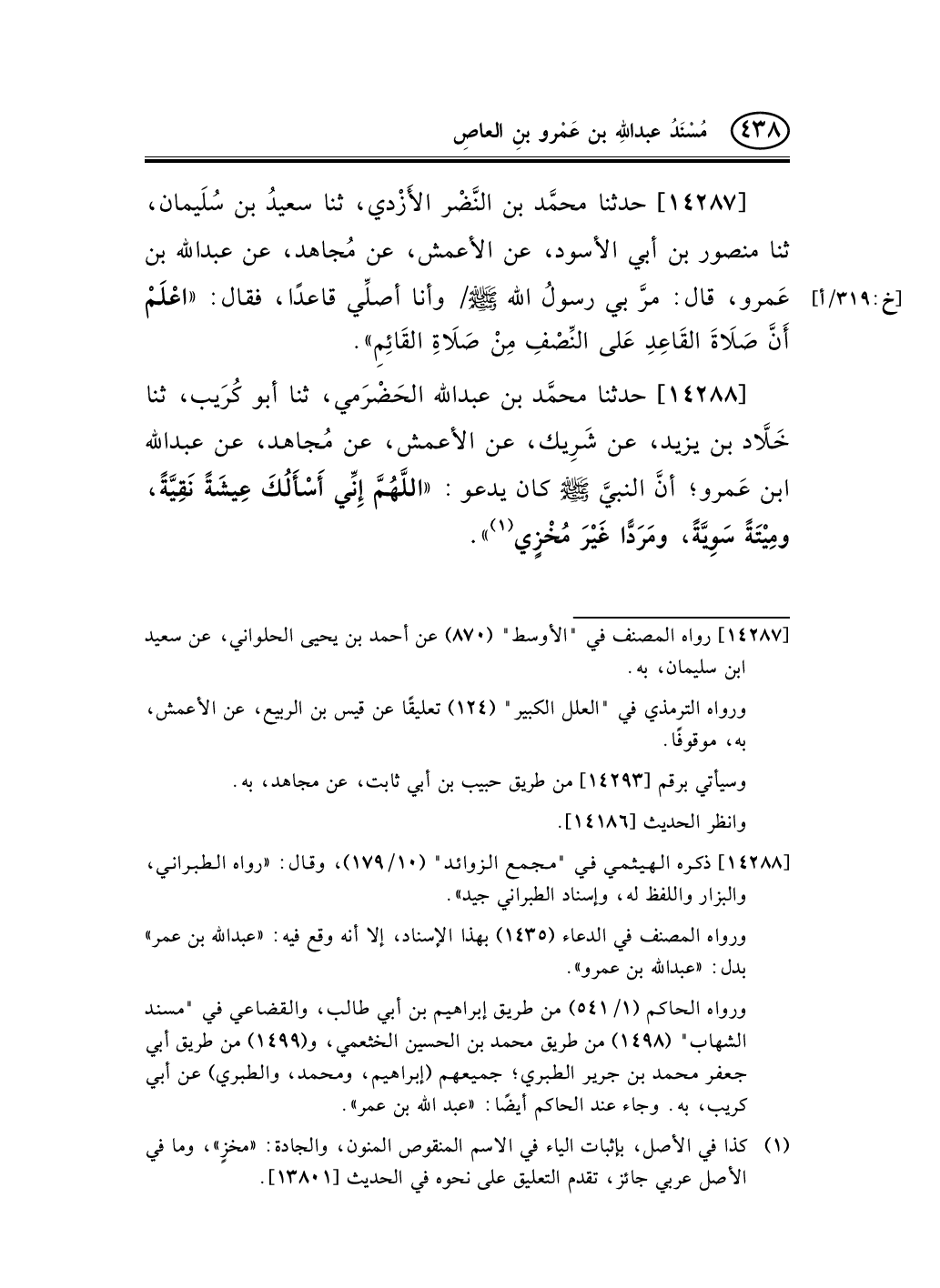 14287 - حدثنا محمَّد بن النَّضْر الأَزْدي، ثنا سعيدُ بن سُلَيمان، ثنا منصور بن أبي الأسود، عن الأعمش، عن مُجاهد، عن عبد الله بن عَمرو، قال: مرَّ بي رسولُ الله صلى الله عليه وسلم/ وأنا أصلِّي قاعدًا، فقال: «اعْلَمْ [خ: 319/أ]