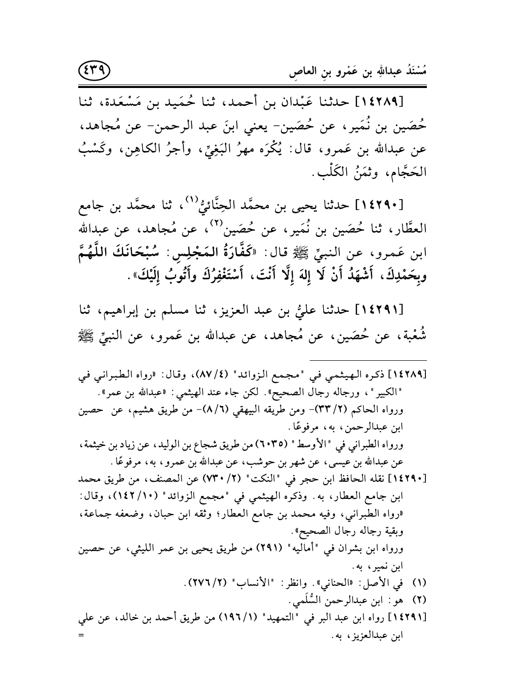 14290 - حدثنا يحيى بن محمَّد الحِنَّائيُّ (¬1) ، ثنا محمَّد بن جامع العطَّار، ثنا حُصَين بن نُمَير، عن حُصَين (¬2) ، عن مُجاهد، عن عبد الله ابن عَمرو، عن النبيِّ صلى الله عليه وسلم قال: «كَفَّارَةُ المَجْلِسِ: سُبْحَانَكَ اللَّهُمَّ وبِحَمْدِكَ، أَشْهَدُ أَنْ لاَ إِلهَ إِلاَّ أَنْتَ، أَسْتَغْفِرُكَ وأَتُوبُ إِلَيْكَ» .