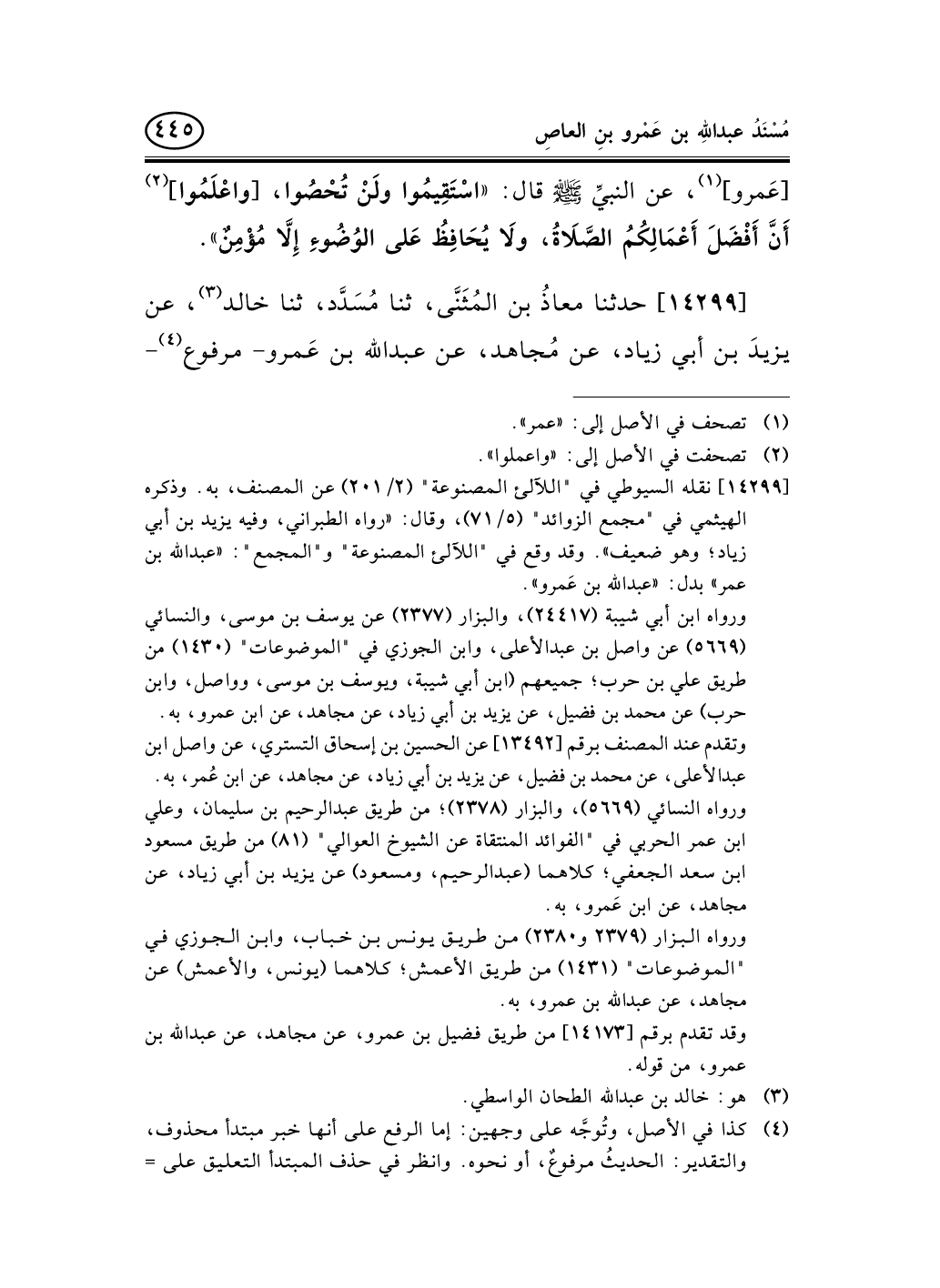 [14299] نقله السيوطي في "اللآلئ المصنوعة" (2/201) عن المصنف، به. وذكره الهيثمي في "مجمع الزوائد" (5/71) ، وقال: «رواه الطبراني، وفيه يزيد بن أبي زياد؛ وهو ضعيف» . وقد وقع في "اللآلئ المصنوعة" و"المجمع": «عبد الله بن عمر» بدل: «عبد الله بن عَمرو» .