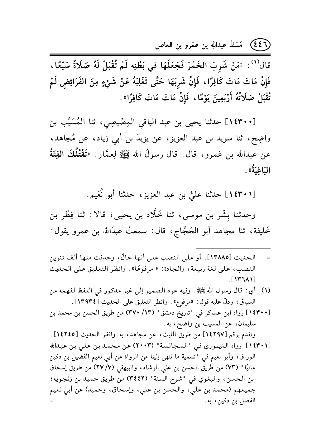 14300 - حدثنا يحيى بن عبد الباقي المِصِّيصِي، ثنا المُسَيَّب بن واضِح، ثنا سويد بن عبد العزيز، عن يزيدَ بن أبي زياد، عن مُجاهد، عن عبد الله بن عَمرو، قال: قال رسولُ الله صلى الله عليه وسلم لِعمَّار: «تَقْتُلُكَ الفِئَةُ البَاغِيَةُ» .