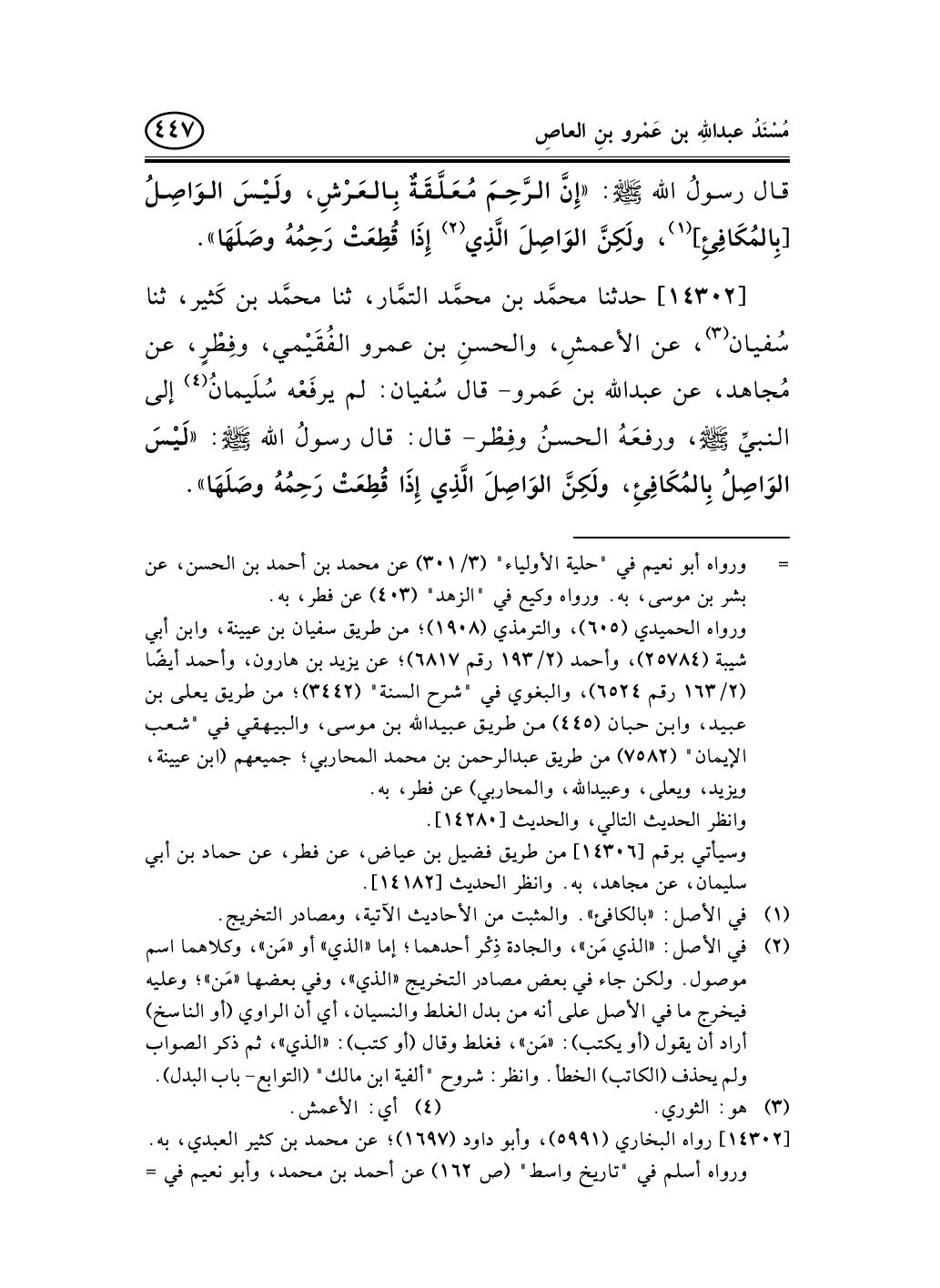 14302 - حدثنا محمَّد بن محمَّد التمَّار، ثنا محمَّد بن كَثير، ثنا سُفيان (¬1) ، عن الأعمشِ، والحسنِ بن عمرو الفُقَيْمي، وفِطْرٍ، عن مُجاهد، عن عبد الله بن عَمرو- قال سُفيان: لم يرفَعْه سُلَيمانُ (¬2) إلى النبيِّ صلى الله عليه وسلم، ورفعَهُ الحسنُ وفِطْر- قال: قال رسولُ الله صلى الله عليه وسلم: «لَيْسَ الوَاصِلُ بِالمُكَافِئِ، ولَكِنَّ الوَاصِلَ الَّذِي إِذَا قُطِعَتْ رَحِمُهُ وصَلَهَا» .