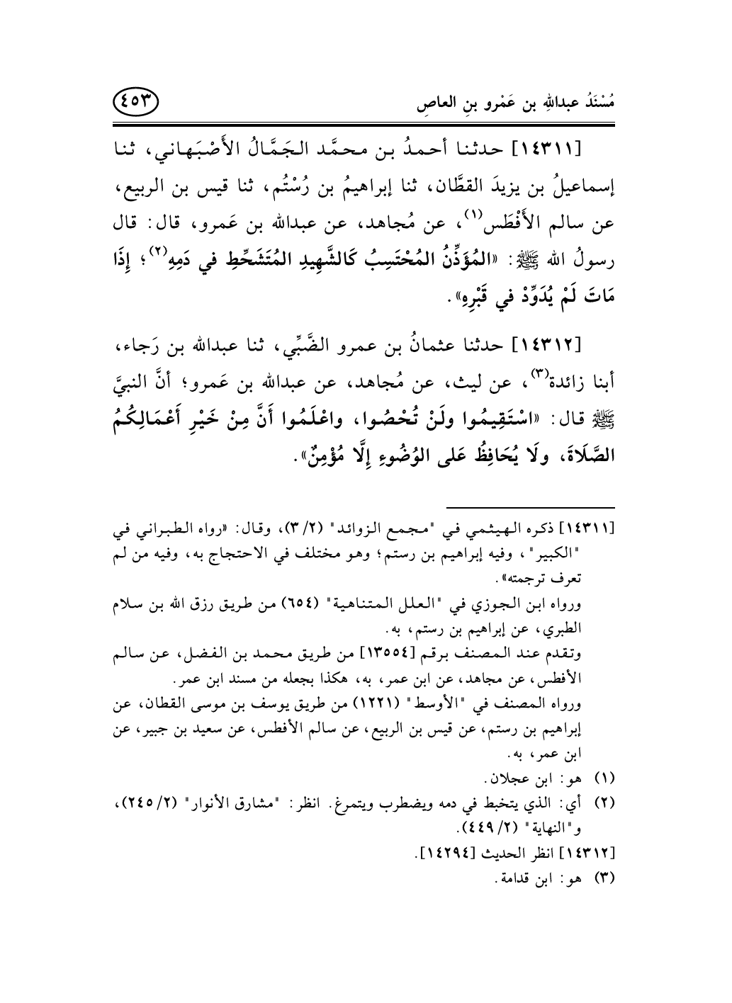 14312 - حدثنا عثمانُ بن عمرو الضَّبِّي، ثنا عبد الله بن رَجاء، أبنا زائدة (¬1) ، عن ليث، عن مُجاهد، عن عبد الله بن عَمرو؛ أنَّ النبيَّ صلى الله عليه وسلم قال: «اسْتَقِيمُوا ولَنْ تُحْصُوا، واعْلَمُوا أَنَّ مِنْ خَيْرِ أَعْمَالِكُمُ الصَّلاَةَ، ولاَ يُحَافِظُ عَلى الوُضُوءِ إِلاَّ مُؤْمِنٌ» .