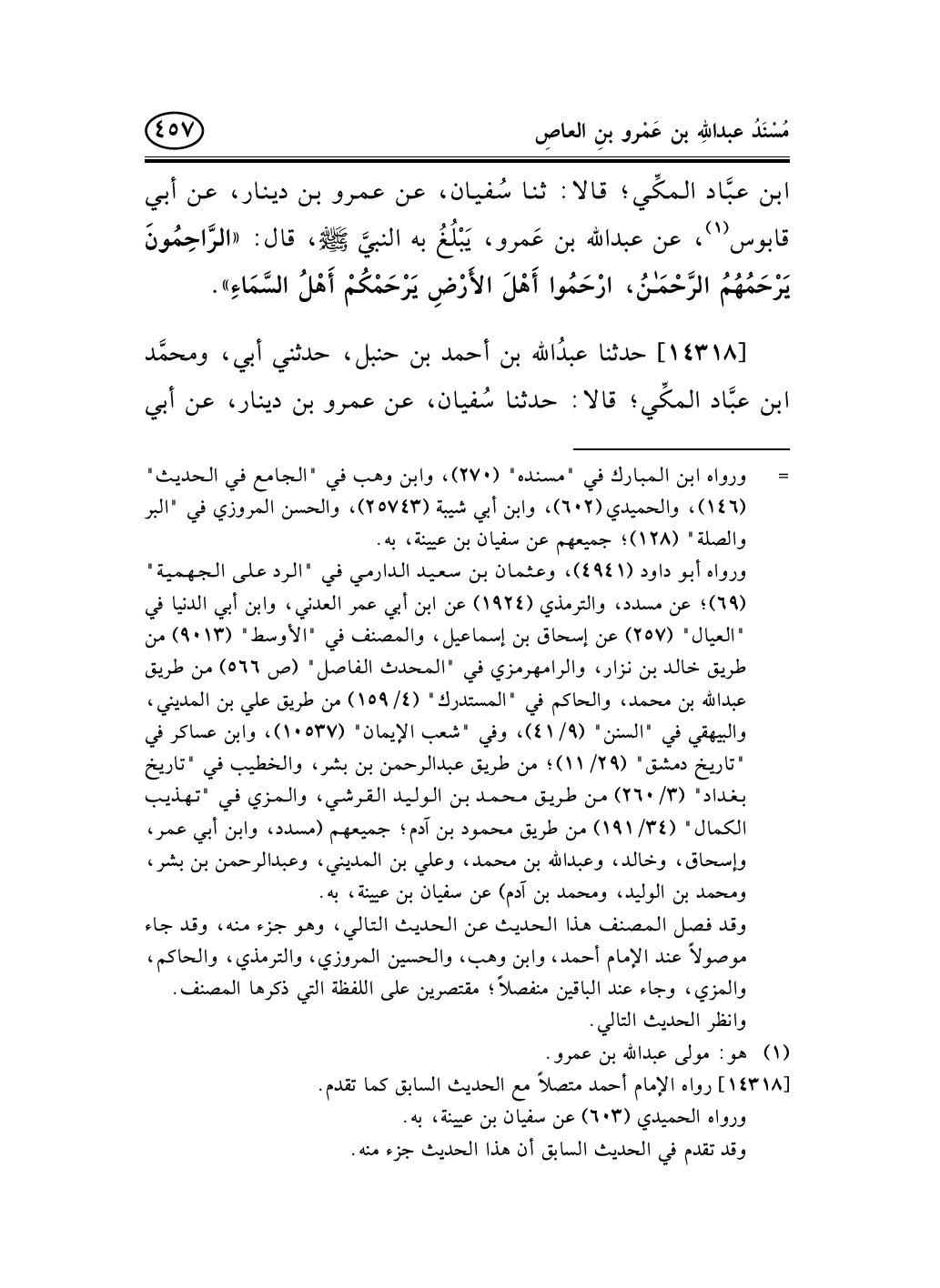14318 - حدثنا عبدُالله بن أحمد بن حنبل، حدثني أبي، ومحمَّد ابن عبَّاد المكِّي؛ قالا: حدثنا سُفيان، عن عمرو بن دينار، عن أبي -[458]- قابوس، عن عبد الله بن عَمرو، يَبْلُغُ به النبيَّ صلى الله عليه وسلم، قال: «الرَّحِمُ شُجْنَةٌ (¬1) مِنَ الرَّحْمَنِ، مَنْ وصَلَهَا وصَلْتُهُ، ومَنْ قَطَعَهَا بَتَتُّهُ (¬2) » .