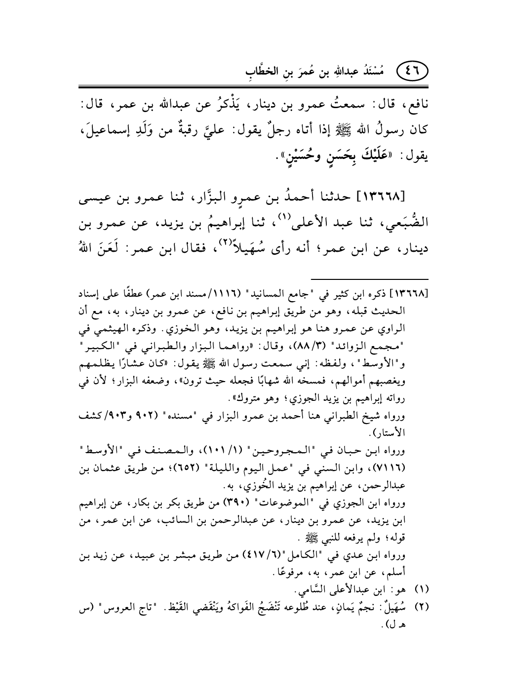13668 - حدثنا أحمدُ بن عمرٍو البزَّار، ثنا عمرو بن عيسى الضُّبَعي، ثنا عبد الأعلى (¬1) ، ثنا إبراهيمُ بن يزيد، عن عمرو بن دينار، عن ابن عمر؛ أنه رأى سُهَيلاً (¬2) ، فقال ابن عمر: لَعَنَ اللهُ -[47]- سُهَيْلاً، سمعتُ رسولَ الله صلى الله عليه وسلم يقول: «كَانَ - سُهَيْلاً (¬3) - عَشَّارًا مِنْ عَشَّارِي اليَمَنِ، فَمَسَخَهُ اللهُ فَعَلَّقَهُ حَيْثُ تَرَوْنَ» .