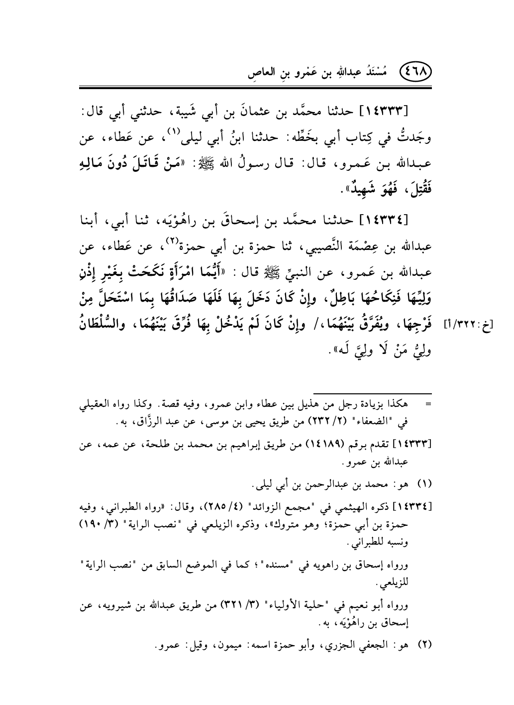 [14333] تقدم برقم (14189) من طريق إبراهيم بن محمد بن طلحة، عن عمه، عن عبد الله بن عمرو.