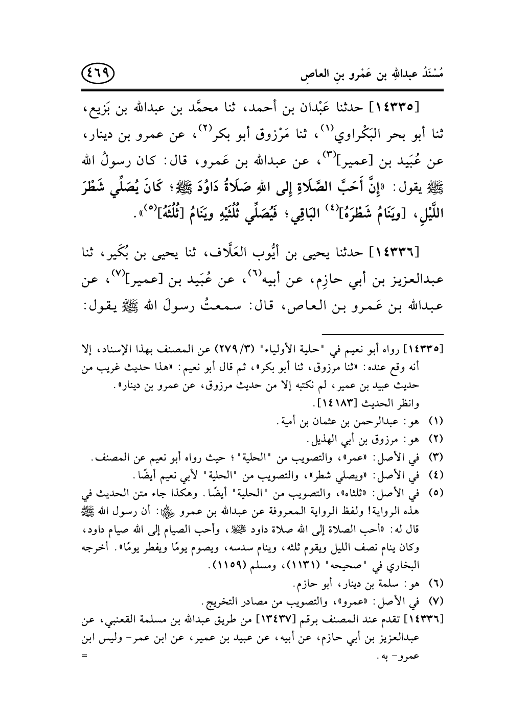 14335 - حدثنا عَبْدان بن أحمد، ثنا محمَّد بن عبد الله بن بَزيع، ثنا أبو بحر البَكْراوي (¬1) ، ثنا مَرْزوق أبو بكر (¬2) ، عن عمرو بن دينار، عن عُبَيد بن [عمير] (¬3) ، عن عبد الله بن عَمرو، قال: كان رسولُ الله صلى الله عليه وسلم يقول: «إِنَّ أَحَبَّ الصَّلاَةِ إِلى اللهِ صَلاَةُ دَاوُدَ صلى الله عليه وسلم؛ كَانَ يُصَلِّي شَطْرَ اللَّيْلِ، [ويَنَامُ شَطْرَهُ] (¬4) البَاقِي؛ فَيُصَلِّي ثُلُثَيْهِ ويَنَامُ [ثُلُثَهُ] (¬5) » .