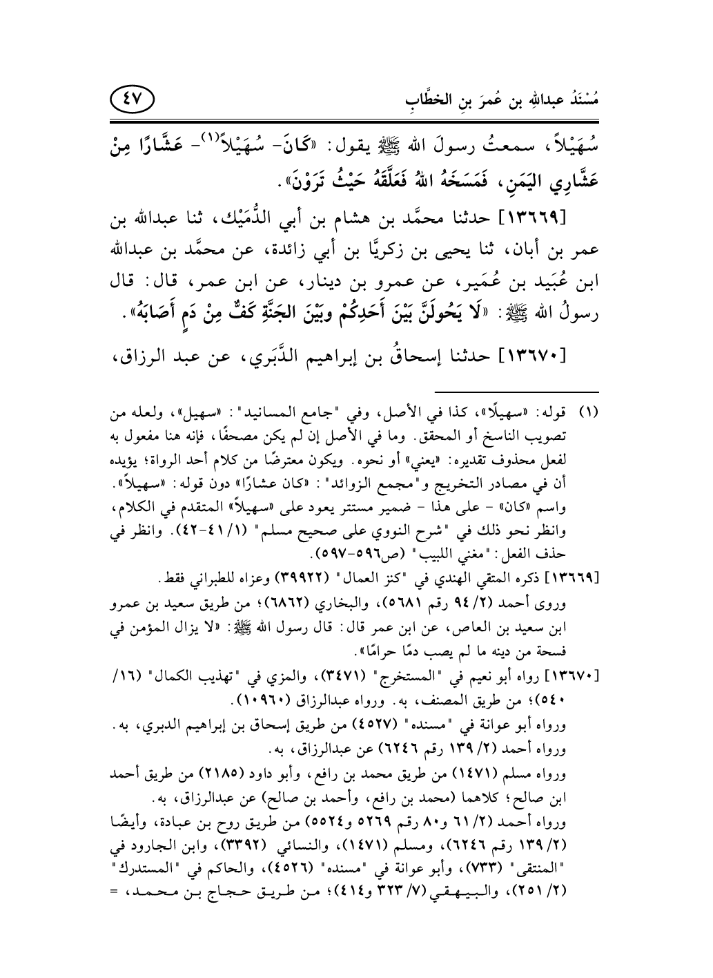 وروى أحمد (2/94 رقم 5681) ، والبخاري (6862) ؛ من طريق سعيد بن عمرو ابن سعيد بن العاص، عن ابن عمر قال: قال رسول الله صلى الله عليه وسلم: «لا يزال المؤمن في فسحة من دينه ما لم يصب دمًا حرامًا» .