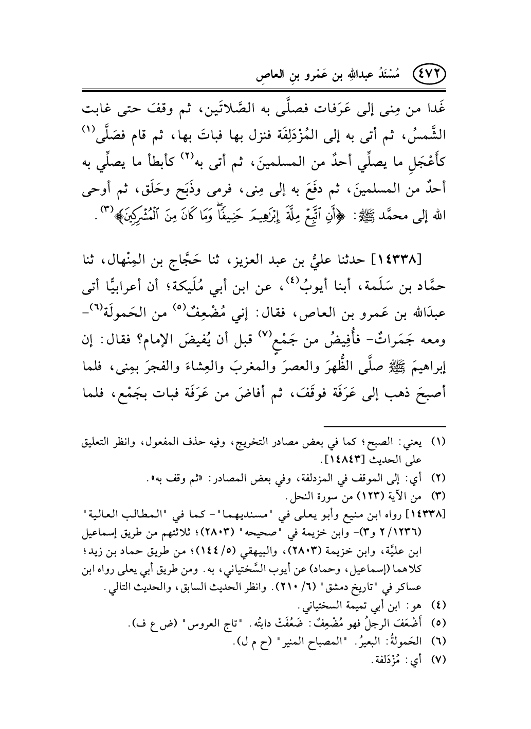 14338 - حدثنا عليُّ بن عبد العزيز، ثنا حَجَّاج بن المِنْهال، ثنا حمَّاد بن سَلَمة، أبنا أيوبُ (¬1) ، عن ابن أبي مُلَيكة؛ أن أعرابيًّا أتى عبدَالله بن عَمرو بن العاص، فقال: إني مُضْعِفٌ (¬2) من الحَمولَة (¬3) - ومعه جَمَراتٌ- فأُفِيضُ من جَمْعٍ (¬4) قبل أن يُفيضَ الإمام؟ فقال: إن إبراهيمَ صلى الله عليه وسلم صلَّى الظُّهرَ والعصرَ والمغربَ والعِشاءَ والفجرَ بمِنى، فلما أصبحَ ذهب إلى عَرَفَة فوقَفَ، ثم أفاضَ من عَرَفَة فبات بجَمْع، فلما -[473]- كانت الصَّلاةُ المُعَجَّلةُ (¬5) صلَّى الفجرَ ثم وقفَ، فلما كانت الصَّلاةُ المُسْفِرَةُ (¬6) أفاضَ، وقد أُمِر نبيُّكم صلى الله عليه وسلم أن يَتَّبع ملَّةَ أبيكم إبراهيمَ.