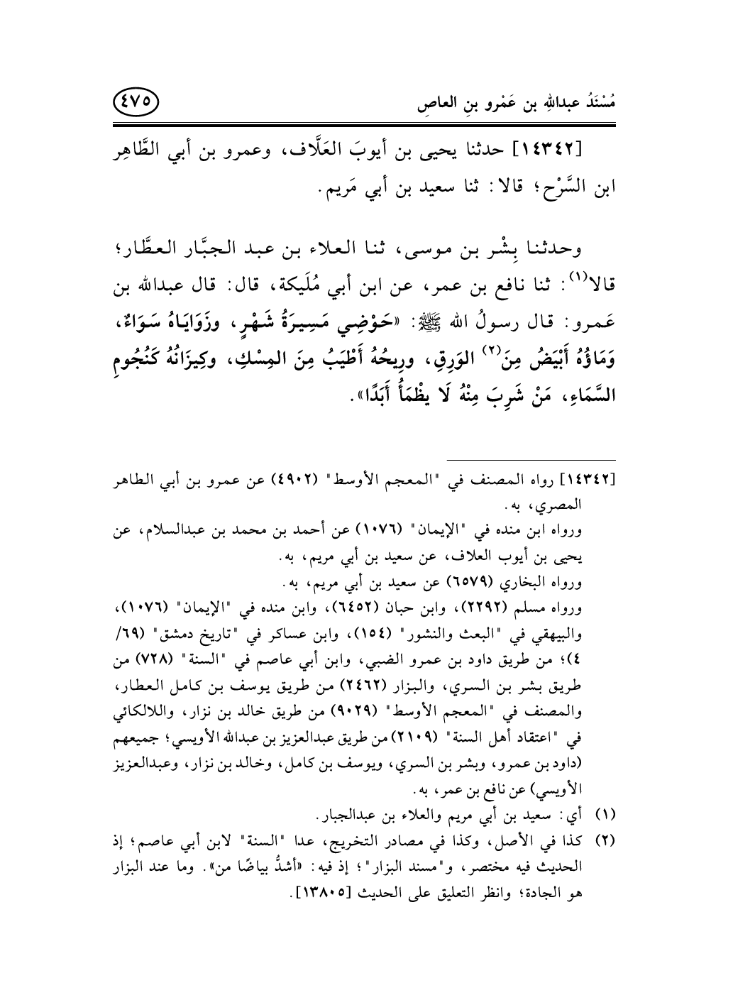 14342 - حدثنا يحيى بن أيوبَ العَلاَّف، وعمرو بن أبي الطَّاهِر ابن السَّرْح؛ قالا: ثنا سعيد بن أبي مَريم.