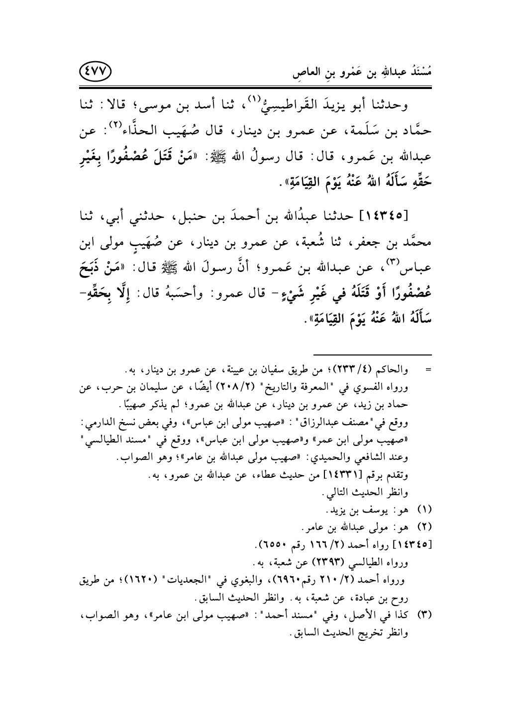 14345 - حدثنا عبدُالله بن أحمدَ بن حنبل، حدثني أبي، ثنا محمَّد بن جعفر، ثنا شُعبة، عن عمرو بن دينار، عن صُهَيبٍ مولى ابن عباس (¬1) ، عن عبد الله بن عَمرو؛ أنَّ رسولَ الله صلى الله عليه وسلم قال: «مَنْ ذَبَحَ عُصْفُورًا أَوْ قَتَلَهُ في غَيْرِ شَيْءٍ - قال عمرو: وأحسَبهُ قال: إِلاَّ بِحَقِّهِ- سَأَلَهُ اللهُ عَنْهُ يَوْمَ القِيَامَةِ» .