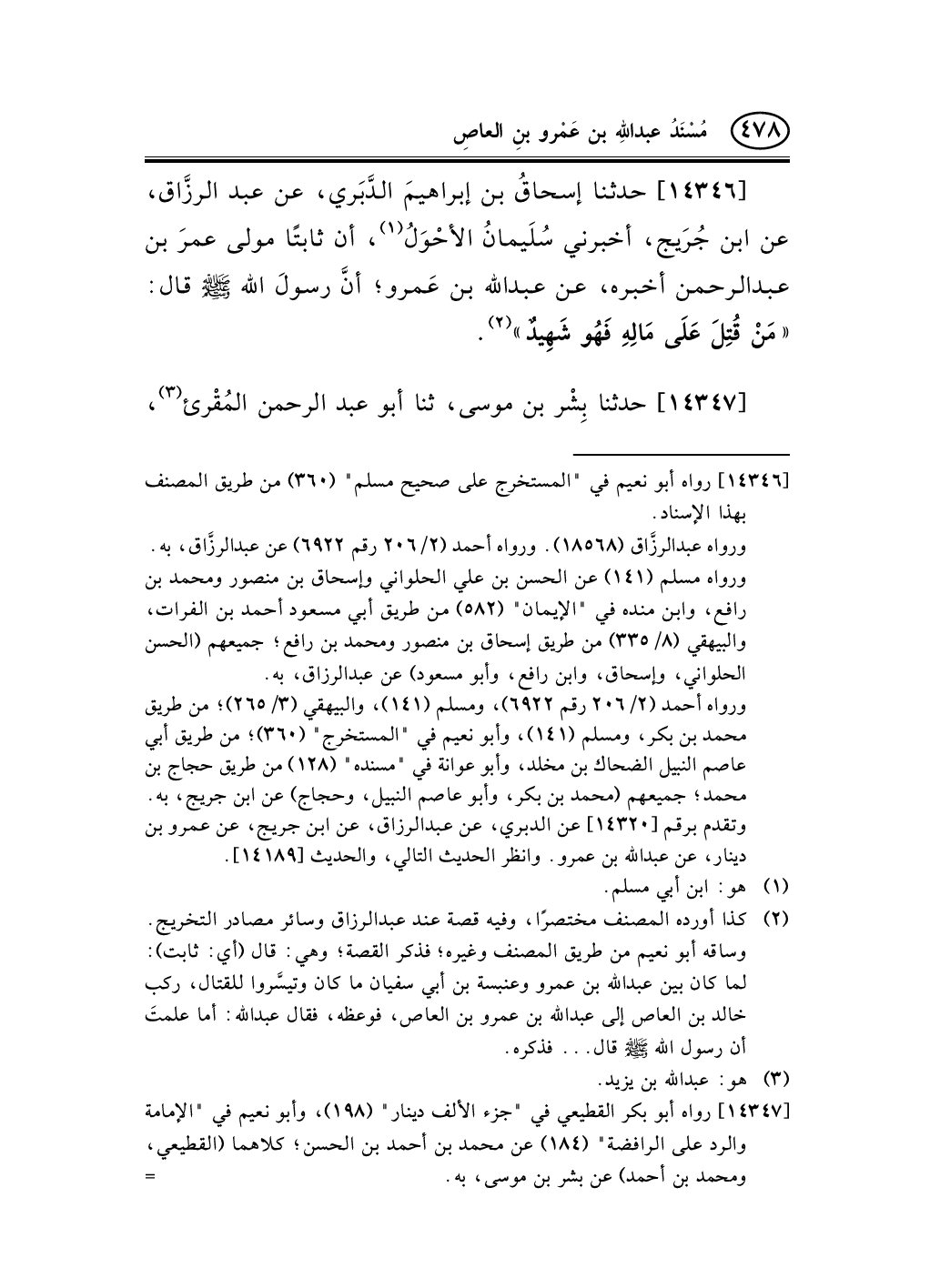 14346 - حدثنا إسحاقُ بن إبراهيمَ الدَّبَري، عن عبد الرزَّاق، عن ابن جُرَيج، أخبرني سُلَيمانُ الأحْوَلُ (¬1) ، أن ثابتًا مولى عمرَ بن عبد الرحمن أخبره، عن عبد الله بن عَمرو؛ أنَّ رسولَ الله صلى الله عليه وسلم قال: «مَنْ قُتِلَ عَلَى مَالِهِ فَهُو شَهِيدٌ» (¬2) .