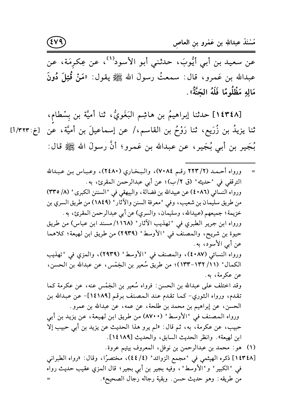 14348 - حدثنا إبراهيمُ بن هاشِم البَغَويُّ، ثنا أميَّة بن بِسْطامٍ، ثنا يزيدُ بن زُرَيع، ثنا رَوْحُ بن القاسم، / عن إسماعيلَ بن أميَّة، عن [خ: 323/أ]