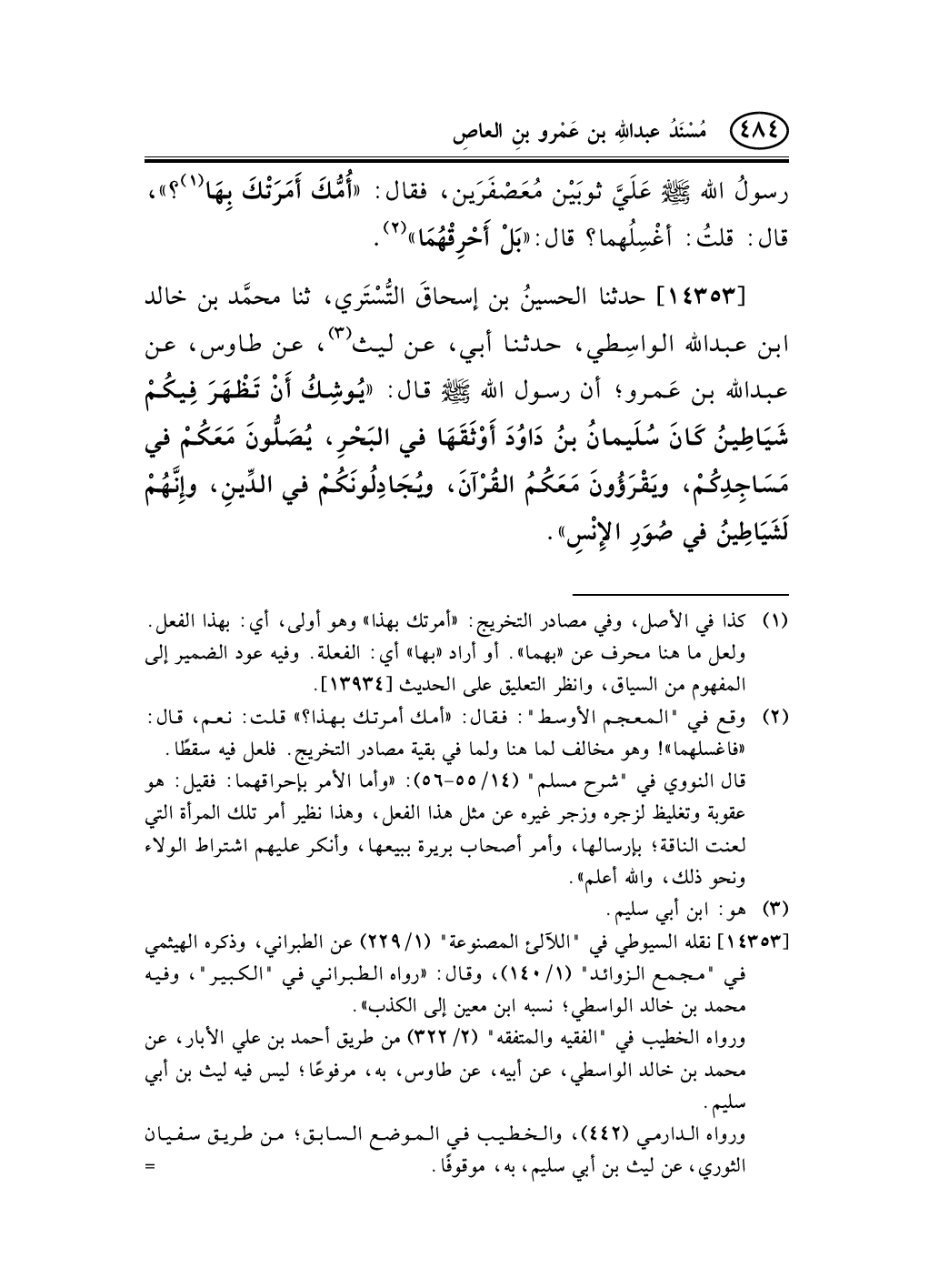 14353 - حدثنا الحسينُ بن إسحاقَ التُّسْتَري، ثنا محمَّد بن خالد ابن عبد الله الواسِطي، حدثنا أبي، عن ليث (¬1) ، عن طاوس، عن عبد الله بن عَمرو؛ أن رسول الله صلى الله عليه وسلم قال: «يُوشِكُ أَنْ تَظْهَرَ فِيكُمْ شَيَاطِينُ كَانَ سُلَيمانُ بنُ دَاوُدَ أَوْثَقَهَا في البَحْرِ، يُصَلُّونَ مَعَكُمْ في مَسَاجِدِكُمْ، ويَقْرَؤُونَ مَعَكُمُ القُرْآنَ، ويُجَادِلُونَكُمْ في الدِّينِِ، وإِنَّهُمْ لَشَيَاطِينُ في صُوَرِ الإِنْسِ» .