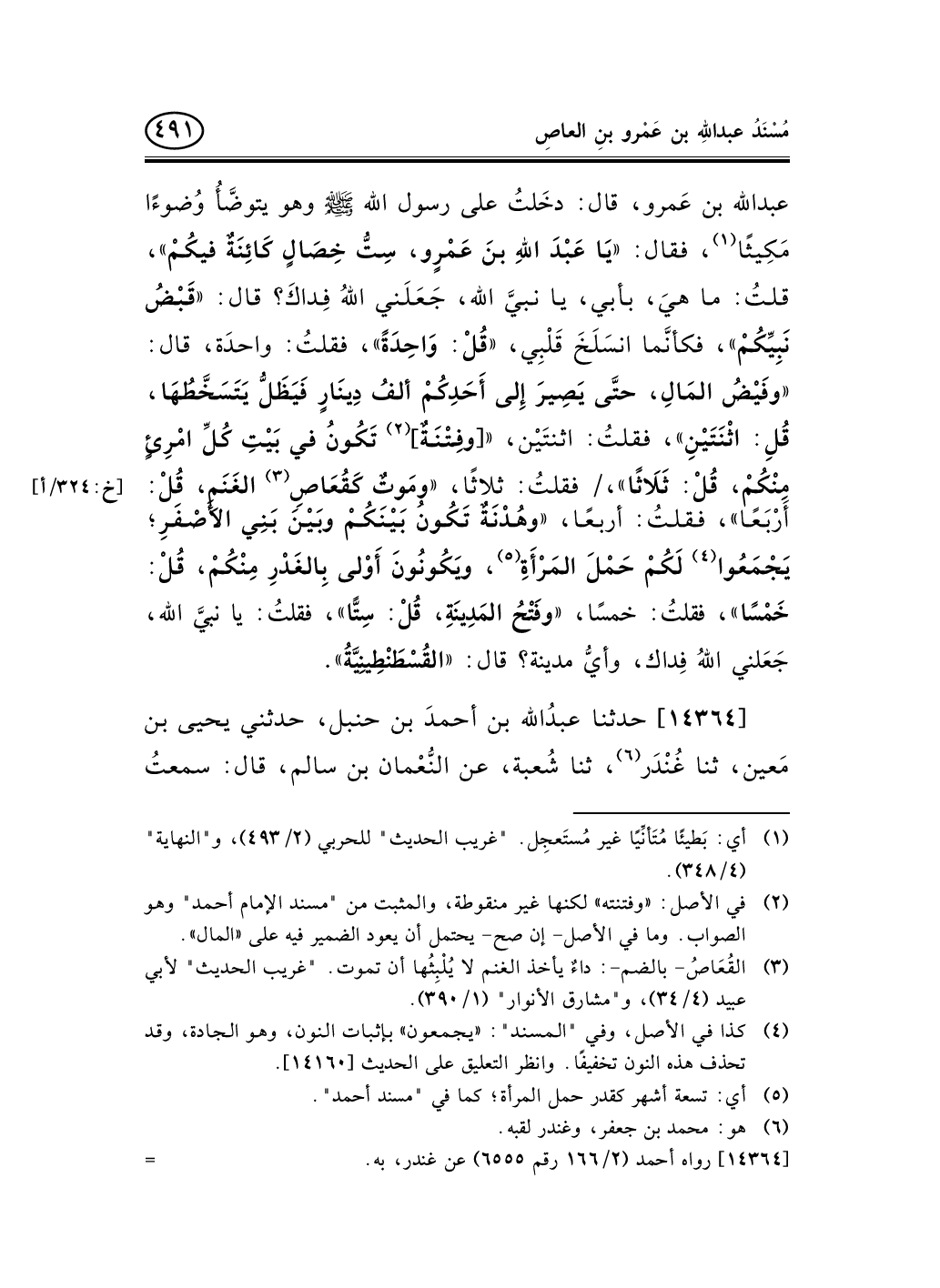 14364 - حدثنا عبدُالله بن أحمدَ بن حنبل، حدثني يحيى بن مَعين، ثنا غُنْدَر (¬1) ، ثنا شُعبة، عن النُّعْمان بن سالم، قال: سمعتُ -[492]- يعقوب بن عاصم يحدِّث؛ أنه سمعَ عبدَالله بن عَمرو يقول: قال رسولُ الله صلى الله عليه وسلم: «يَخْرُجُ الدَّجَّالُ في أُمَّتِي فَيَمْكُثُ فيهَا أَرْبَعِينَ» ، لا أدري قال: يَومًا، أو شَهرًا، أو سَنةً، «فَيَبْعَثُ اللهُ عِيسَى كَأَنَّهُ عُروَةُ ابنُ مَسْعُودٍ الثَّقَفِيُّ، فَيَطْلُبُهُ فَيُهْلِكُهُ، ثُمَّ يَمْكُثُ النَّاسُ سَبْعَ سِنِينَ لَيْسَ بَيْنَ اثْنَيْنِ عَدَاوَةٌ، ثُمَّ يُرْسِلُ اللهُ رِيحًا بَارِدَةً مِنَ السَّمَاءِ، فَلاَ يُبْقَى أَحَدًا (¬2) في قَلْبِهِ مِثْقَالُ حَبَّةٍ مِنْ إِيمَانٍ إِلاَّ قَبَضَتْهُ» .