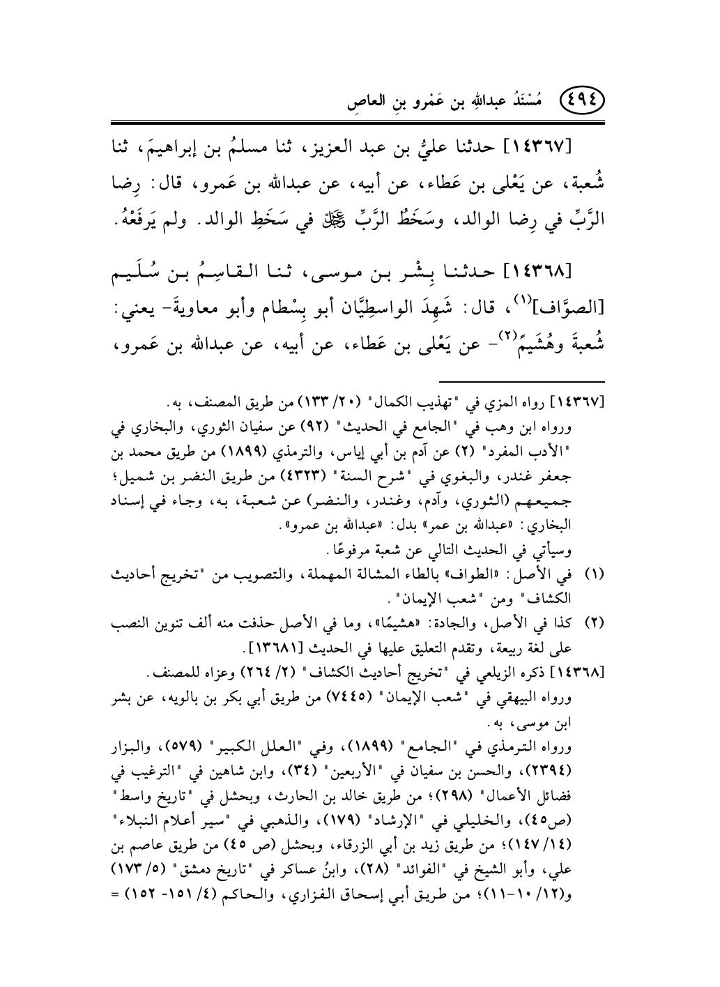 14368 - حدثنا بِشْر بن موسى، ثنا القاسِمُ بن سُلَيم [الصوَّاف] (¬1) ، قال: شَهِدَ الواسطِيَّان أبو بِسْطام وأبو معاويةَ- يعني: شُعبةَ وهُشَيمً (¬2) - عن يَعْلى بن عَطاء، عن أبيه، عن عبد الله بن عَمرو، -[495]- قال: قال رسولُ الله صلى الله عليه وسلم: «رِضَا الرَّبِّ في رَضَا الوَالِدَيْنِ، وسَخَطُ الرَّبِّ في سَخَطِهِمَا» .
