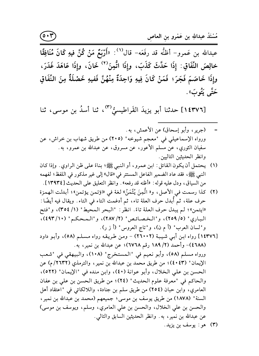 14376 - حدثنا أبو يزيدَ القَراطيسيُّ (¬1) ، ثنا أسدُ بن موسى، ثنا -[504]- يحيى بن عيسى، وعبد الله بن نُمَير؛ عن الأعمش، عن عبد الله بن مُرَّة، عن مَسروق، عن عبد الله بن عَمرو، عن النبيِّ صلى الله عليه وسلم؛ مثلَ حديث الثوري.