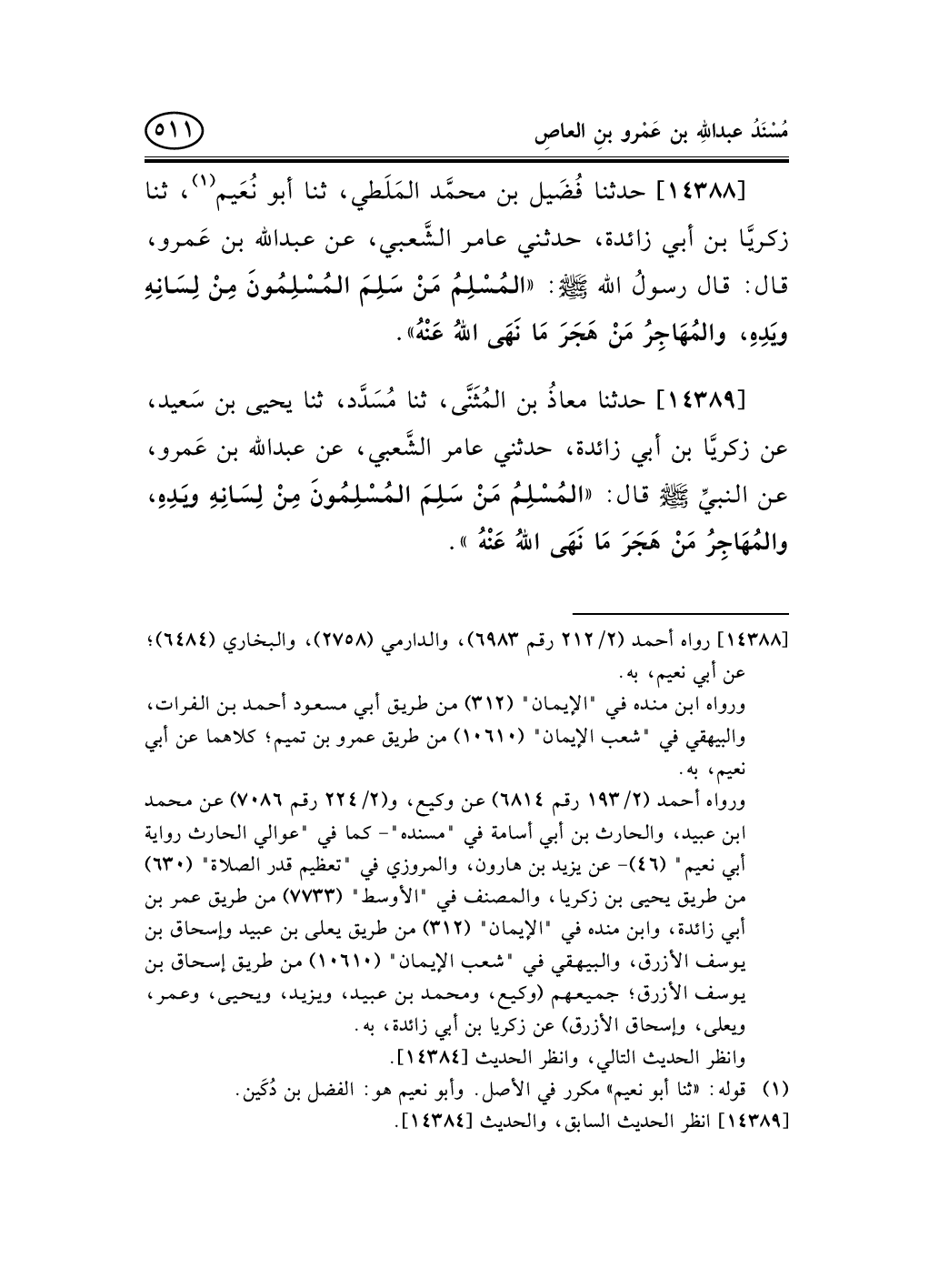 14388 - حدثنا فُضَيل بن محمَّد المَلَطي، ثنا أبو نُعَيم (¬1) ، ثنا زكريَّا بن أبي زائدة، حدثني عامر الشَّعبي، عن عبد الله بن عَمرو، قال: قال رسولُ الله صلى الله عليه وسلم: «المُسْلِمُ مَنْ سَلِمَ المُسْلِمُونَ مِنْ لِسَانِهِ ويَدِهِ، والمُهَاجِرُ مَنْ هَجَرَ مَا نَهَى اللهُ عَنْهُ» .