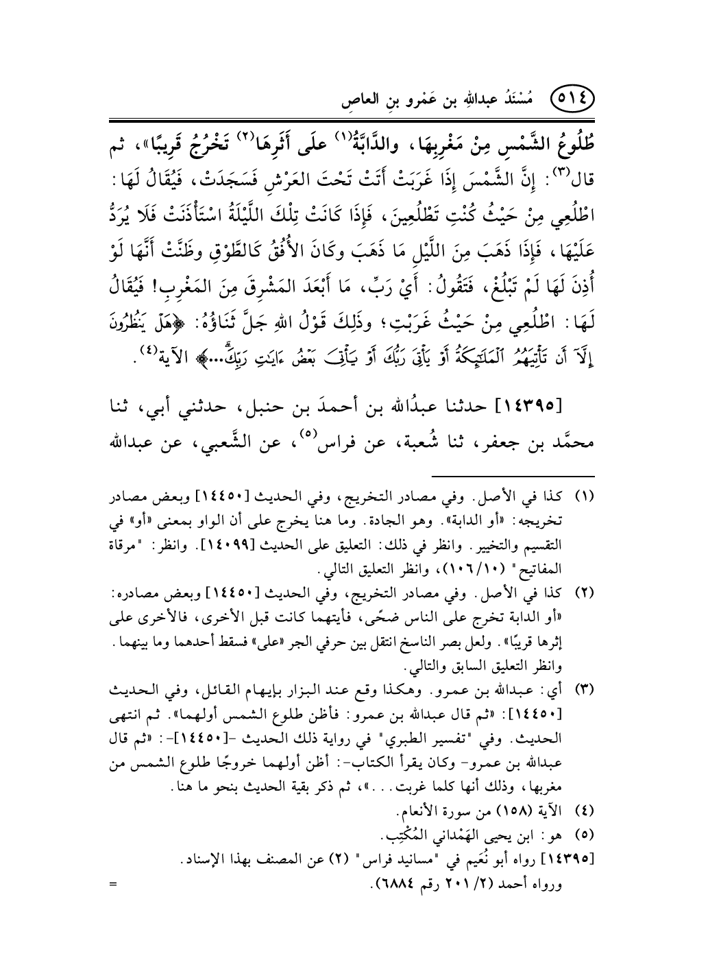 14395 - حدثنا عبدُالله بن أحمدَ بن حنبل، حدثني أبي، ثنا محمَّد بن جعفر، ثنا شُعبة، عن فراس (¬1) ، عن الشَّعبي، عن عبد الله -[515]- ابن عَمرو، عن النبيِّ صلى الله عليه وسلم قال: «الكَبَائِرُ: الإِشْرَاكُ بِاللهِ، وعُقُوقُ الوَالِدَيْنِ، أَو قَتْلُ النَّفْسِ - شُعبةُ الشاكُّ- ويَمِينُ الغَمُوسِ (¬2) » .