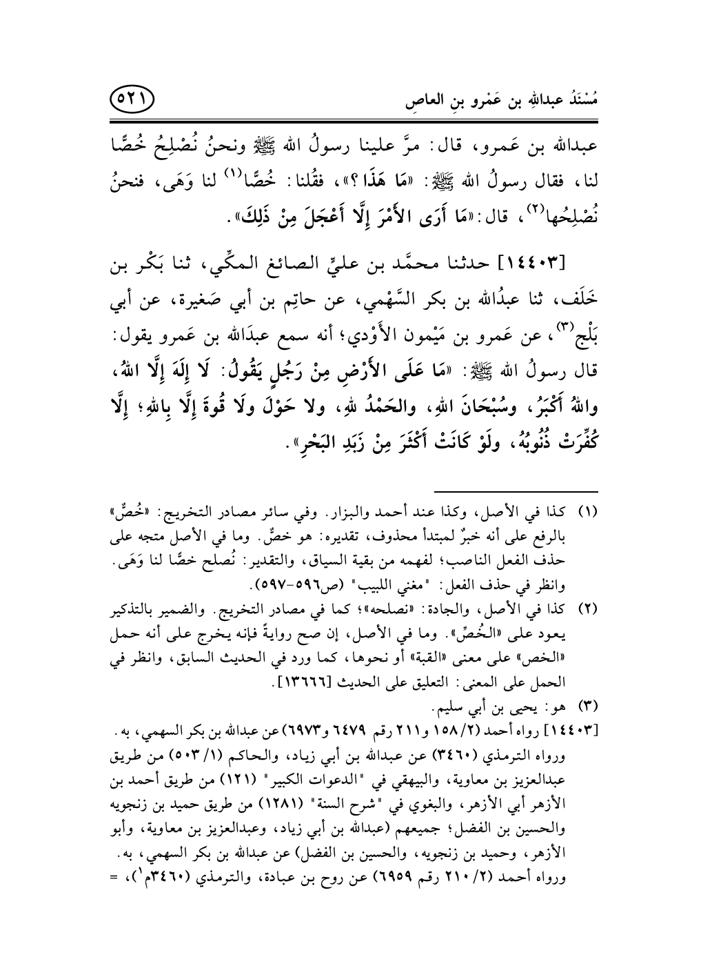 14403 - حدثنا محمَّد بن عليٍّ الصائغ المكِّي، ثنا بَكْر بن خَلَف، ثنا عبدُالله بن بكر السَّهْمي، عن حاتِم بن أبي صَغيرة، عن أبي بَلْج (¬1) ، عن عَمرو بن مَيْمون الأَوْدي؛ أنه سمع عبدَالله بن عَمرو يقول: قال رسولُ الله صلى الله عليه وسلم: «مَا عَلَى الأَرْضِ مِنْ رَجُلٍ يَقُولُ: لاَ إِلَهَ إِلاَّ اللهُ، واللهُ أَكْبَرُ، وسُبْحَانَ اللهِ، والحَمْدُ للهِ، ولا حَوْلَ ولاَ قُوةَ إِلاَّ بِاللهِ؛ إِلاَّ كُفِّرَتْ ذُنُوبُهُ، ولَوْ كَانَتْ أَكْثَرَ مِنْ زَبَدِ البَحْرِ» .