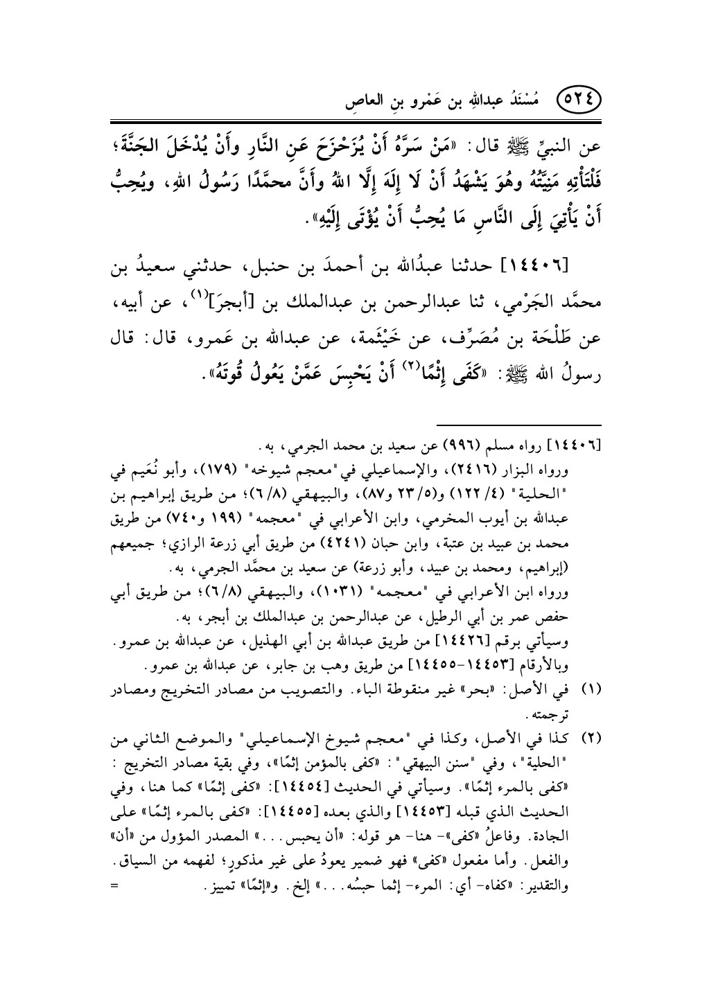 14406 - حدثنا عبدُالله بن أحمدَ بن حنبل، حدثني سعيدُ بن محمَّد الجَرْمي، ثنا عبد الرحمن بن عبد الملك بن [أبجرَ] (¬1) ، عن أبيه، عن طَلْحَة بن مُصَرِّف، عن خَيْثَمة، عن عبد الله بن عَمرو، قال: قال رسولُ الله صلى الله عليه وسلم: «كَفَى إِثْمًا (¬2) أَنْ يَحْبِسَ عَمَّنْ يَعُولُ قُوتَهُ» .