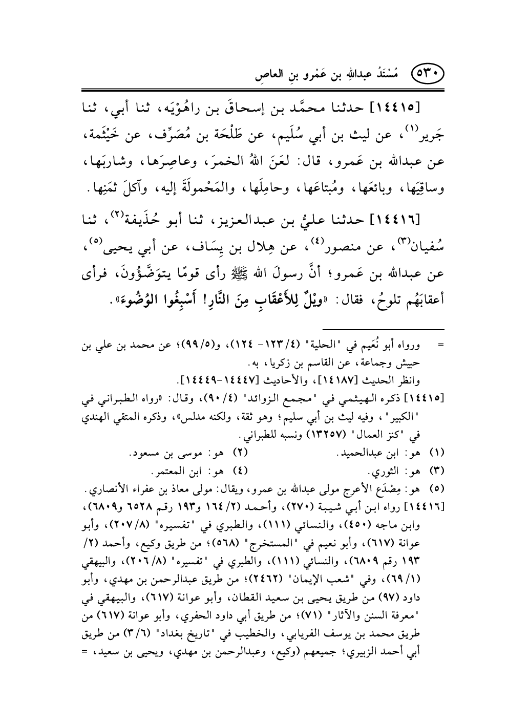 14416 - حدثنا عليُّ بن عبد العزيز، ثنا أبو حُذَيفة (¬1) ، ثنا سُفيان (¬2) ، عن منصور (¬3) ، عن هِلال بن يِسَاف، عن أبي يحيى (¬4) ، عن عبد الله بن عَمرو؛ أنَّ رسولَ الله صلى الله عليه وسلم رأى قومًا يتوَضَّؤُونَ، فرأى أعقابَهُم تلوحُ، فقال: «ويْلٌ لِلأَعْقَابِ مِنَ النَّارِ! أَسْبِغُوا الوُضُوءَ» .