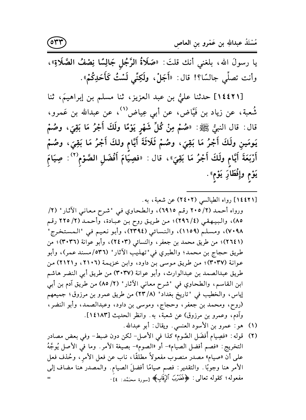 14421 - حدثنا عليُّ بن عبد العزيز، ثنا مسلم بن إبراهيمَ، ثنا شُعبة، عن زياد بن فَيَّاض، عن أبي عِياض (¬1) ، عن عبد الله بن عَمرو، قال: قال النبيُّ صلى الله عليه وسلم: «صُمْ مِنْ كُلِّ شَهْرٍ يَوْمًا ولَكَ أَجْرُ مَا بَقِيَ، وصُمْ يَومَينِ ولَكَ أَجْرُ مَا بَقِيَ، وصُمْ ثَلاَثَةَ أَيَّامٍ ولكََ أَجْرُ مَا بَقِيَ، وصُمْ أَرْبَعَةَ أَيَّامٍ ولَكَ أَجْرُ مَا بَقِيَ» ، قال: «فصِيَامَ أَفْضَلِ الصَّوْمِ (¬2) : صِيَامَ ِ يَوْمٍ وإِفْطَارَ ِ يَوْمٍ» .