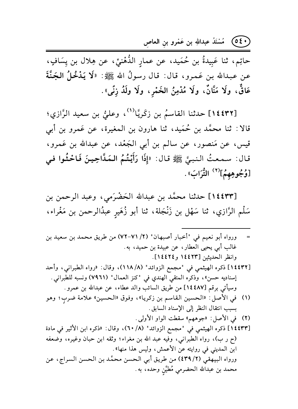 14432 - حدثنا القاسمُ بن زكَريَّا (¬1) ، وعليُّ بن سعيد الرَّازي؛ قالا: ثنا محمَّد بن حُمَيد، ثنا هارون بن المغيرة، عن عَمرو بن أبي قيس، عن مَنصور، عن سالم بن أبي الجَعْد، عن عبد الله بن عَمرو، قال: سمعتُ النبيَّ صلى الله عليه وسلم قال: «إِذَا رَأَيْتُمُ المَدَّاحِينَ فَاحْثُوا في [وُجُوهِهِمُ] (¬2) التُّرَابَ» .