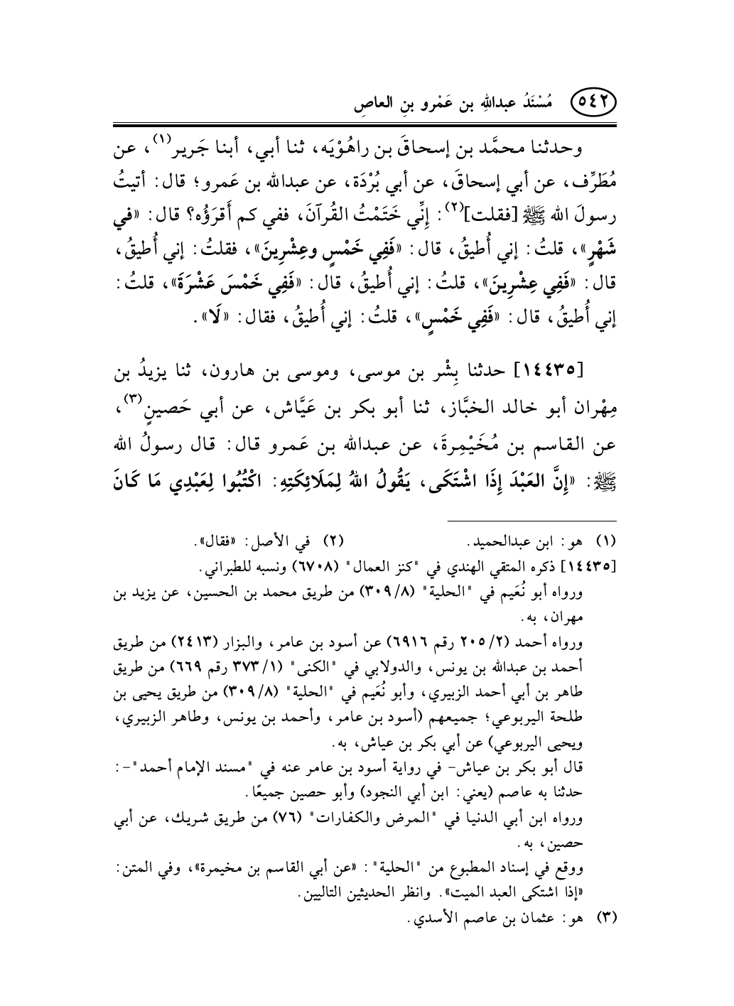 14435 - حدثنا بِشْر بن موسى، وموسى بن هارون، ثنا يزيدُ بن مِهْران أبو خالد الخبَّاز، ثنا أبو بكر بن عَيَّاش، عن أبي حَصينٍ (¬1) ، عن القاسم بن مُخَيْمِرةَ، عن عبد الله بن عَمرو قال: قال رسولُ الله صلى الله عليه وسلم: «إِنَّ العَبْدَ إِذَا اشْتَكَى، يَقُولُ اللهُ لِمَلاَئِكَتِهِ: اكْتُبُوا لِعَبْدِي مَا كَانَ -[543]- يَعْمَلُ طُلُقًا (¬2) ، حَتَّى يَبْدُوَ لِي أَقْبِضُهُ أم أُطْلِقُهُ» .