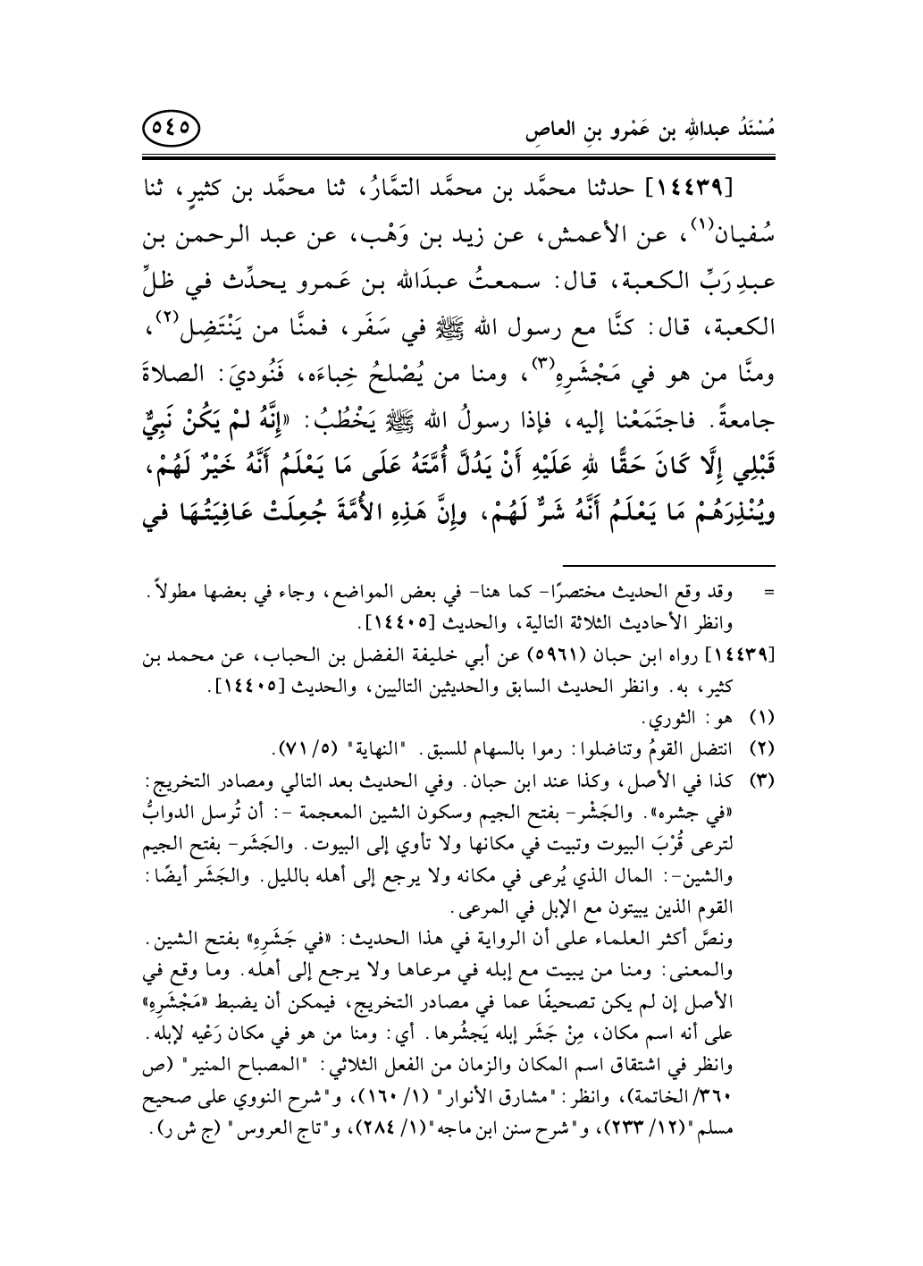 14439 - حدثنا محمَّد بن محمَّد التمَّارُ، ثنا محمَّد بن كثيرٍ، ثنا سُفيان (¬1) ، عن الأعمش، عن زيد بن وَهْب، عن عبد الرحمن بن عبدِ رَبِّ الكعبة، قال: سمعتُ عبدَالله بن عَمرو يحدِّث في ظلِّ الكعبة، قال: كنَّا مع رسول الله صلى الله عليه وسلم في سَفَر، فمنَّا من يَنْتَضِل (¬2) ، ومنَّا من هو في مَجْشَرِهِ (¬3) ، ومنا من يُصْلحُ خِباءَه، فَنُوديَ: الصلاةَ جامعةً. فاجتَمَعْنا إليه، فإذا رسولُ الله صلى الله عليه وسلم يَخْطُبُ: «إِنَّهُ لمْ يَكُنْ نَبِيٌّ قَبْلِي إِلاَّ كَانَ حَقًّا للهِ عَلَيْهِ أَنْ يَدُلَّ أُمَّتَهُ عَلَى مَا يَعْلَمُ أَنَّهُ خَيْرٌ لَهُمْ، ويُنْذِرَهُمْ مَا يَعْلَمُ أَنَّهُ شَرٌّ لَهُمْ، وإِنَّ هَذِهِ الأُمَّةَ جُعِلَتْ عَافِيَتُهَا في -[546]- أَوَّلِهَا، وسَيُصِيبُ آخِرَهَا بَلاَءٌ، وتَرْدُفُ (¬4) الفِتَنُ بَعْضُهَا بَعْضًا، فَتَجِيءُ فِتْنَةٌ فَيَقُولُ: هَذِهِ مُهْلِكَتِي. ثُمَّ تَنْكَشِفُ، ثُمَّ تَجِيءُ (¬5) فَيَقُولُ: هَذِهِ مُهْلِكَتِي. ثُمَّ تَنْكَشِفُ. فَمَنْ أَحَبَّ مِنْكُمْ أَنْ يُزَحْزَحَ عَنِ النَّارِ ويُدْخَلَ الجَنَّةَ فَلْتُدْرِكْهُ مَنِيَّتُهُ وهُوَ يُؤْمِنُ بِاللهِ واليَوْمِ الآخِرِ، ولْيَأْتِ إِلَى النَّاسِ الَّذِي يُحِبُّ أَنْ يُؤْتَى إِلَيْهِ، ومَنْ بَايَعَ إِمَامًا وأَعْطَاهُ صَفْقَةَ يَدِهِ وثَمَرَةَ قَلْبِهِ فَلْيُطِعْهُ مَا اسْتَطَاعَ» .