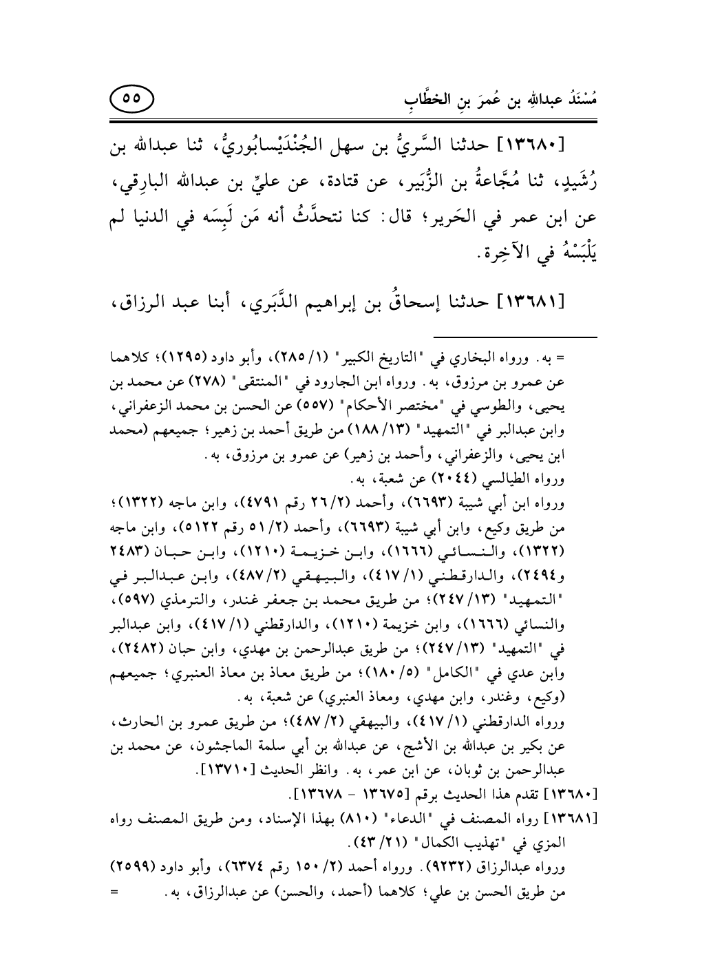 13680 - حدثنا السَّريُّ بن سهل الجُنْدَيْسابُوريُّ، ثنا عبد الله بن رُشَيدٍ، ثنا مُجَّاعةُ بن الزُّبَير، عن قتادة، عن عليِّ بن عبد الله البارِقي، عن ابن عمر في الحَرير؛ قال: كنا نتحدَّثُ أنه مَن لَبِسَه في الدنيا لم يَلْبَسْهُ في الآخِرة.