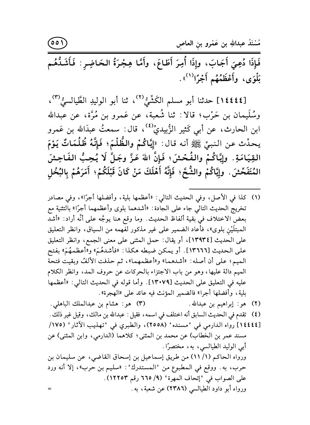 14444 - حدثنا أبو مسلم الكَشِّيُّ (¬1) ، ثنا أبو الوليدِ الطَّيالسيُّ (¬2) ، وسُلَيمان بن حَرْب؛ قالا: ثنا شُعبة، عن عَمرو بن مُرَّة، عن عبد الله ابن الحارث، عن أبي كَثير الزُّبيديِّ (¬3) ، قال: سمعتُ عبدَالله بن عَمرو يحدِّث عن النبيِّ صلى الله عليه وسلم أنه قال: «إِيَّاكُمْ والظُّلْمَ؛ فَإِنَّهُ ظُلُمَاتٌ يَوْمَ القِيَامَةِ. وإِيَّاكُمْ والفُحْشَ؛ فَإِنَّ اللهَ عَزَّ وجَلَّ لاَ يُحِبُّ الفَاحِشَ المُتَفَحِّشَ. وإِيَّاكُمْ والشُّحَّ؛ فَإِنَّهُ أَهْلَكَ مَنْ كَانَ قَبْلَكُمْ؛ أَمَرَهُمْ بِالبُخْلِ -[552]- فَبَخِلُوا، وأَمَرَهُمْ بِالفُجُورِ فَفَجَرُوا، وأَمَرَهُمْ بِقَطْعِ الرَّحِمِ فَقَطَعُوا» ، فقام رجلٌ فقال: يا رسولَ الله، أيُّ الإسلام أفضَلُ؟ قال: «أَنْ يَسْلَمَ المُسْلِمُونَ مِنْ لِسَانِكَ ويَدِكَ» ، فقام ذلك الرجلُ [أَوْ] (¬4) رجُلٌ آخرُ فقال: يا رسولَ الله، أيُّ الهجرَة أفضَلُ؟ قال: «أَنْ تَهْجُرَ مَا كَرِهَ -[553]- رَبُّكَ» ، ثم قال: «الهِجْرَةُ هِجْرَتَانِ: هِجْرَةٌ لِلْحَاضِرِ، وهِجْرَةٌ لِلْبَادِي، فَأَمَّا هِجْرَةُ البَادِي: فَتُجِيبُهُ إِذَا دَعَاكَ، وتُطِيعُهُ إِذَا أَمَرَكَ، والحَاضِرُ (¬5) : أَعْظمُهَا بَلِيَّةً وأَفْضَلُهَا أَجْرًا» .