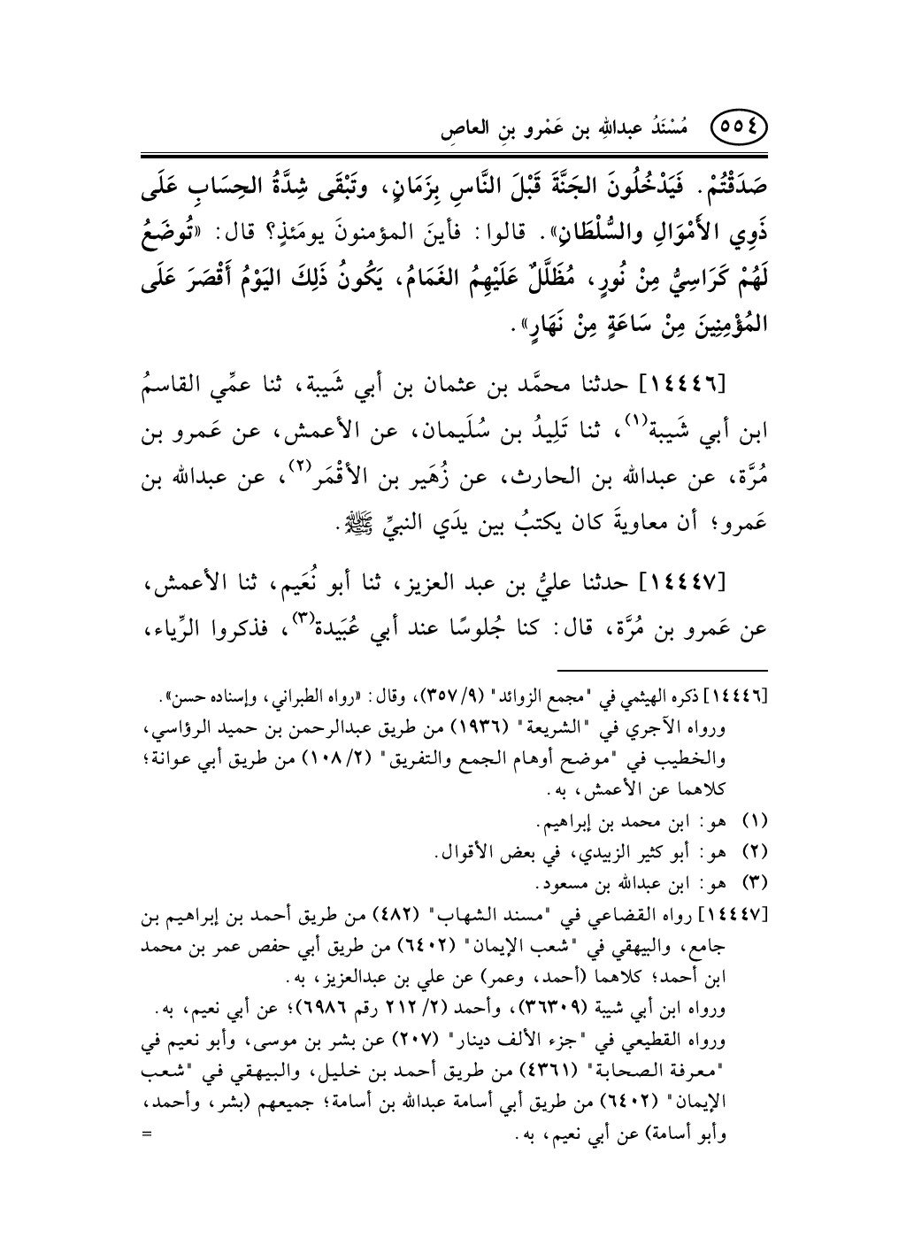 14447 - حدثنا عليُّ بن عبد العزيز، ثنا أبو نُعَيم، ثنا الأعمش، عن عَمرو بن مُرَّة، قال: كنا جُلوسًا عند أبي عُبَيدة (¬1) ، فذكروا الرِّياء، -[555]- فقال شيخٌ يُكْنى أبا يزيد: سمعتُ عبدَالله بن عَمرو يقول: قال رسولُ الله صلى الله عليه وسلم: «مَنْ سَمَّعَ النَّاسَ بِعَمَلِهِ سَمَّعَ اللهُ بِهِ سَامِعَ خَلْقِهِ، وحَقَّرَهُ، وصَغَّرَهُ» .