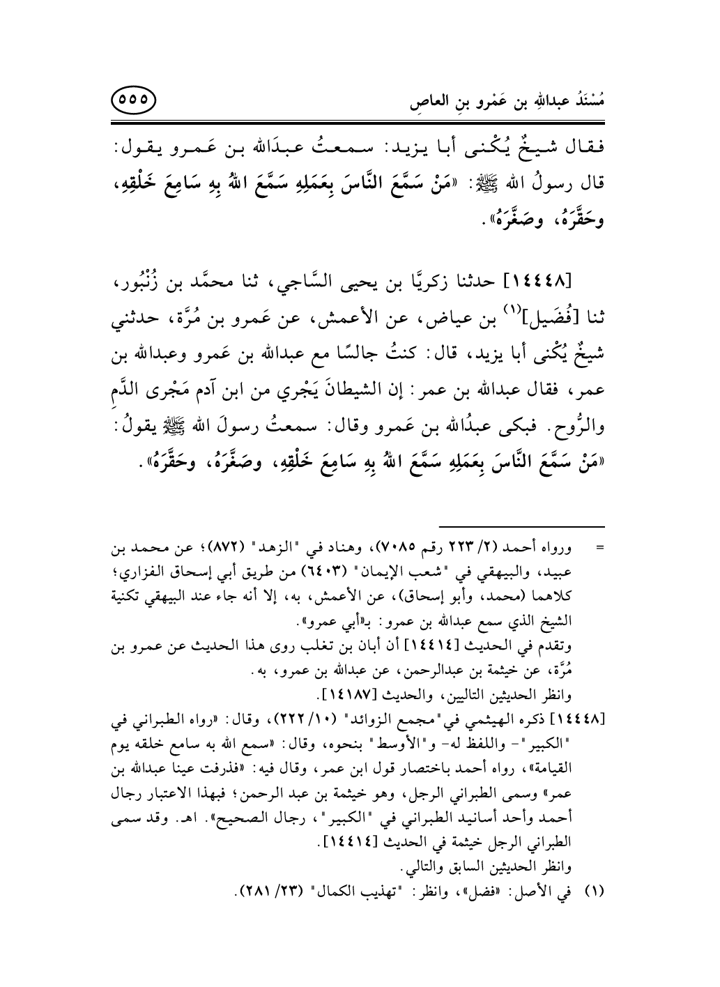 14448 - حدثنا زكريَّا بن يحيى السَّاجي، ثنا محمَّد بن زُنْبُور، ثنا [فُضَيل] (¬1) بن عياض، عن الأعمش، عن عَمرو بن مُرَّة، حدثني شيخٌ يُكْنى أبا يزيد، قال: كنتُ جالسًا مع عبد الله بن عَمرو وعبد الله بن عمر، فقال عبد الله بن عمر: إن الشيطانَ يَجْري من ابن آدم مَجْرى الدَّمِ والرُّوح. فبكى عبدُالله بن عَمرو وقال: سمعتُ رسولَ الله صلى الله عليه وسلم يقولُ: «مَنْ سَمَّعَ النَّاسَ بِعَمَلِهِ سَمَّعَ اللهُ بِهِ سَامِعَ خَلْقِهِ، وصَغَّرَهُ، وحَقَّرَهُ» .