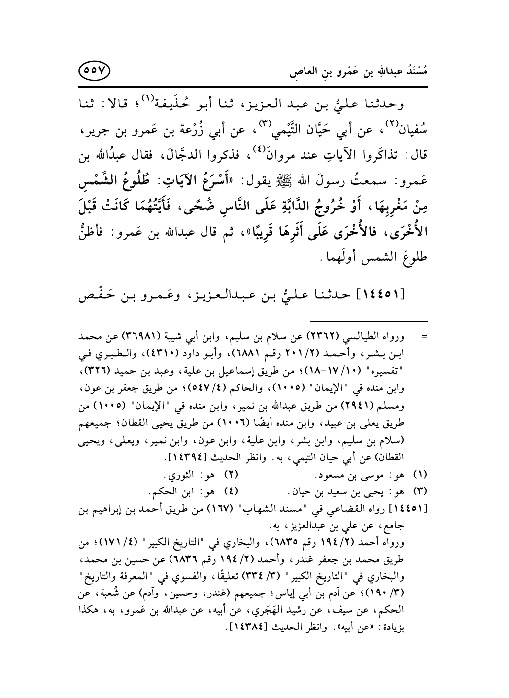 ورواه أحمد (2/194 رقم 6835) ، والبخاري في "التاريخ الكبير" (4/171) ؛ من طريق محمد بن جعفر غندر، وأحمد (2/194 رقم 6836) عن حسين بن محمد، والبخاري في "التاريخ الكبير" (3/334) تعليقًا، والفسوي في "المعرفة والتاريخ" (3/190) ؛ عن آدم بن أبي إياس؛ جميعهم (غندر، وحسين، وآدم) عن شُعبة، عن الحكم، عن سيف، عن رشيد الهَجَري، عن أبيه، عن عبد الله بن عَمرو، به، هكذا بزيادة: «عن أبيه» . وانظر الحديث [14384] . -[558]-