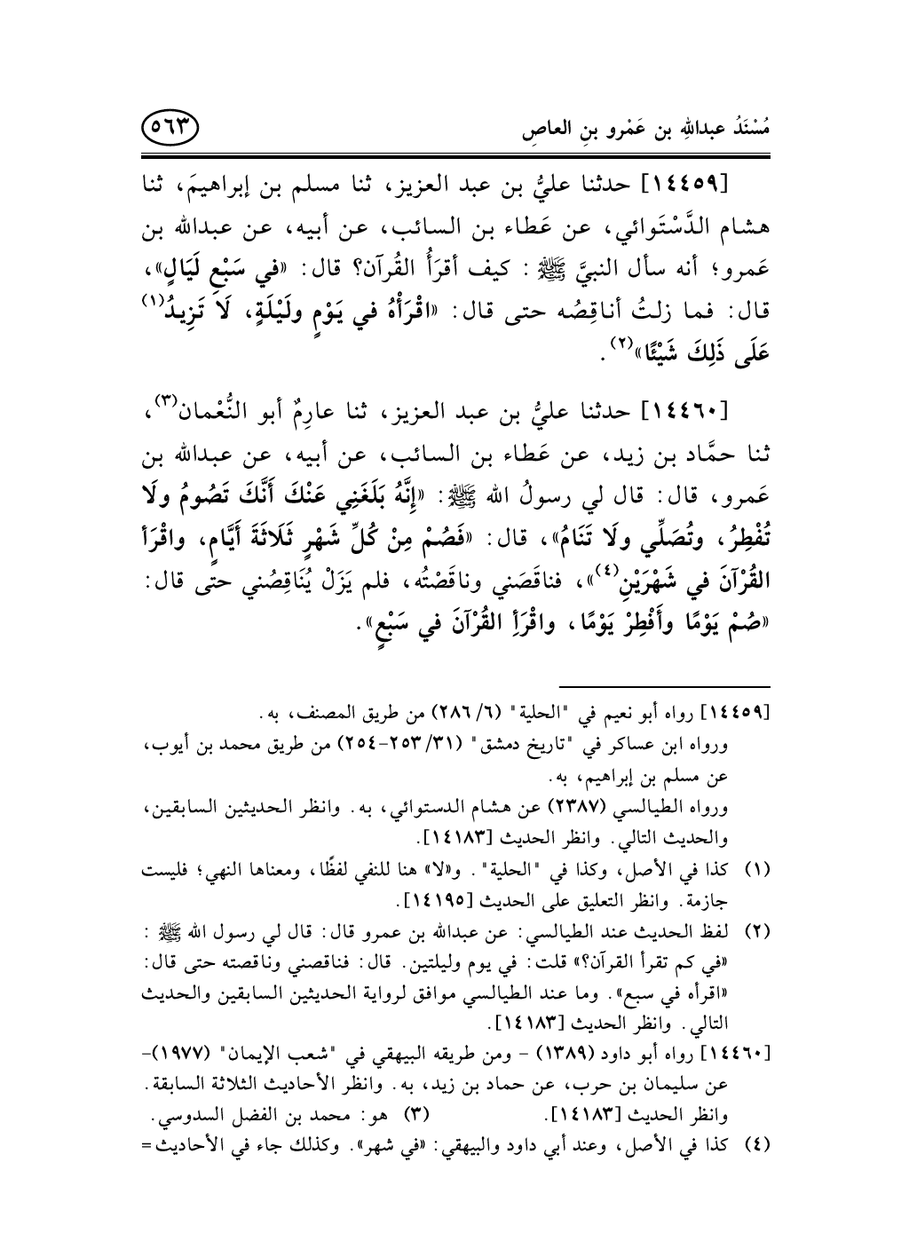 14459 - حدثنا عليُّ بن عبد العزيز، ثنا مسلم بن إبراهيمَ، ثنا هشام الدَّسْتَوائي، عن عَطاء بن السائب، عن أبيه، عن عبد الله بن عَمرو؛ أنه سأل النبيَّ صلى الله عليه وسلم: كيف أقرَأُ القُرآن؟ قال: «في سَبْعِ لَيَالٍ» ، قال: فما زلتُ أناقِصُه حتى قال: «اقْرَأْهُ في يَوْمٍ ولَيْلَةٍ، لاَ تَزِيدُ (¬1) عَلَى ذَلِكَ شَيْئًا» (¬2) .