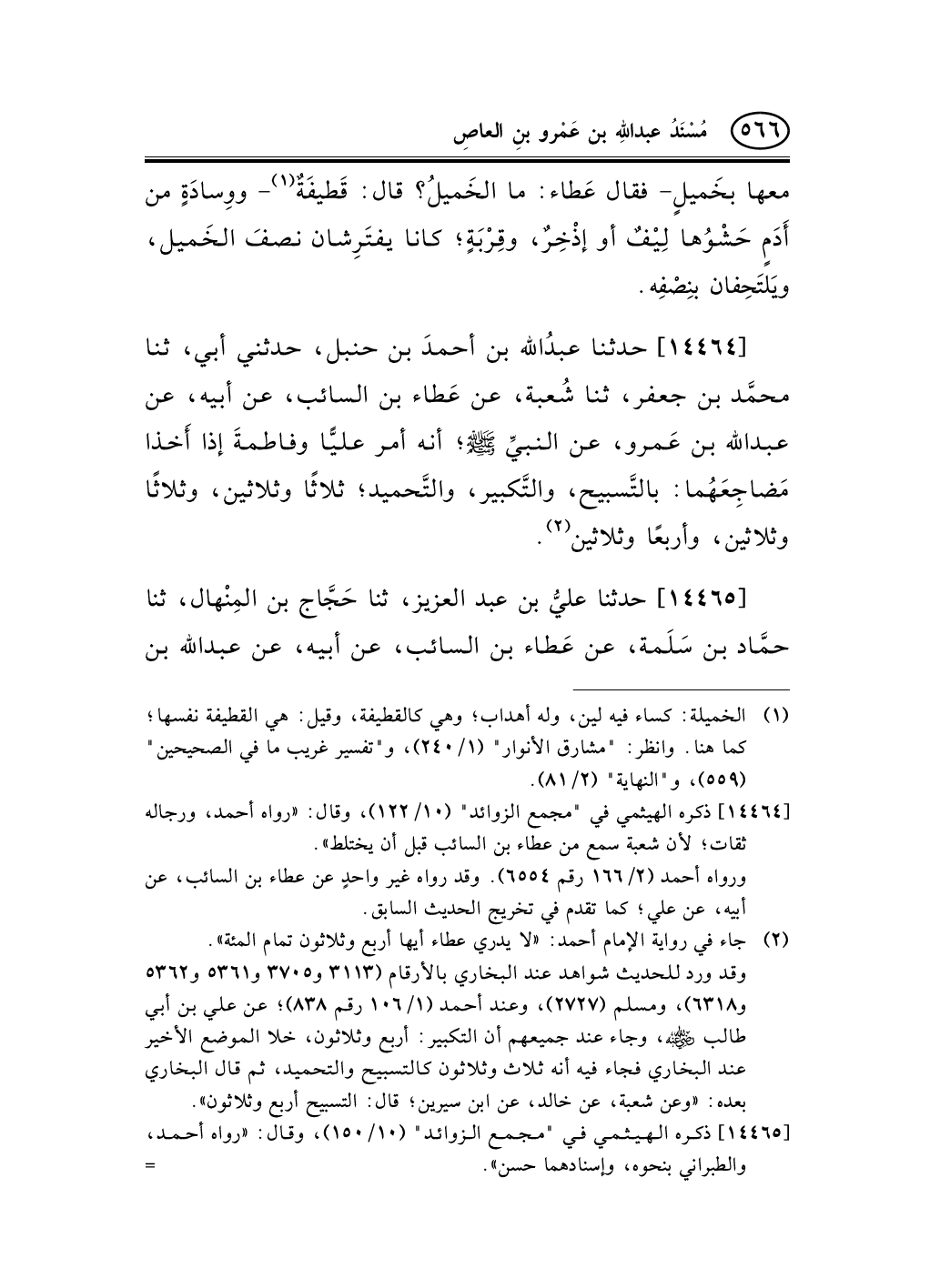 14464 - حدثنا عبدُالله بن أحمدَ بن حنبل، حدثني أبي، ثنا محمَّد بن جعفر، ثنا شُعبة، عن عَطاء بن السائب، عن أبيه، عن عبد الله بن عَمرو، عن النبيِّ صلى الله عليه وسلم؛ أنه أمر عليًّا وفاطمةَ إذا أَخذا مَضاجِعَهُما: بالتَّسبيح، والتَّكبير، والتَّحميد؛ ثلاثًا وثلاثين، وثلاثًا وثلاثين، وأربعًا وثلاثين (¬1) .
