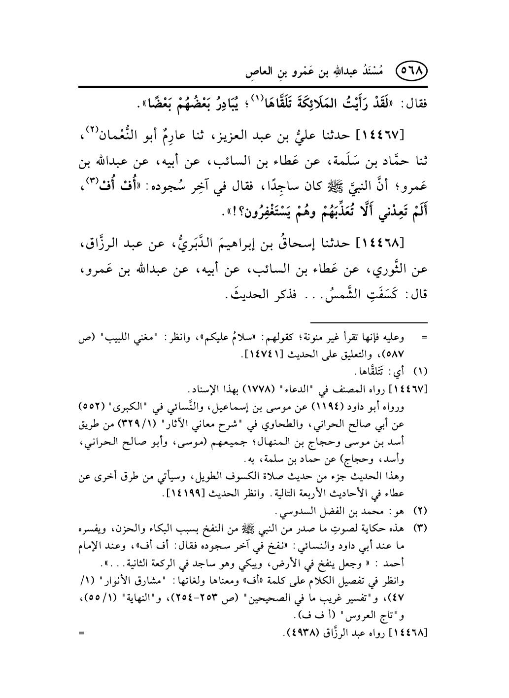14467 - حدثنا عليُّ بن عبد العزيز، ثنا عارِمٌ أبو النُّعْمان (¬1) ، ثنا حمَّاد بن سَلَمة، عن عَطاء بن السائب، عن أبيه، عن عبد الله بن عَمرو؛ أنَّ النبيَّ صلى الله عليه وسلم كان ساجِدًا، فقال في آخِر سُجوده: «أُفْ أُفْ (¬2) ، أَلَمْ تَعِدْني أَلاَّ تُعَذِّبَهُمْ وهُمْ يَسْتَغْفِرُون؟!» .