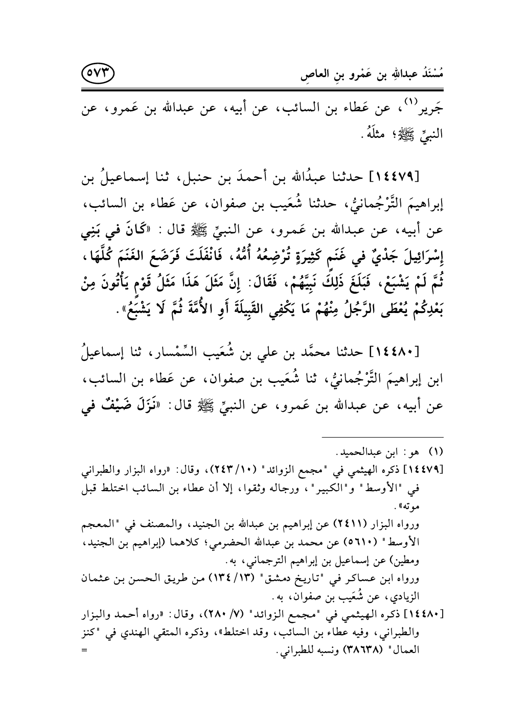 14479 - حدثنا عبدُالله بن أحمدَ بن حنبل، ثنا إسماعيلُ بن إبراهيمَ التَّرْجُمانيُّ، حدثنا شُعَيب بن صفوان، عن عَطاء بن السائب، عن أبيه، عن عبد الله بن عَمرو، عن النبيِّ صلى الله عليه وسلم قال: «كَانَ في بَنِي إِسْرَائِيلَ جَدْيٌ في غَنَمٍ كَثِيرَةٍ تُرْضِعُهُ أُمُّهُ، فَانْفَلَتَ فَرَضَعَ الغَنَمَ كُلَّهَا، ثُمَّ لَمْ يَشْبَعْ، فَبَلَغَ ذَلِكَ نَبِيَّهُمْ، فَقَالَ: إِنَّ مَثَلَ هَذَا مَثَلُ قَوْمٍ يَأْتُونَ مِنْ بَعْدِكُمْ يُعْطَى الرَّجُلُ مِنْهُمْ مَا يَكْفِي القَبِيلَةَ أَوِ الأُمَّةَ ثُمَّ لاَ يَشْبَعُ» .