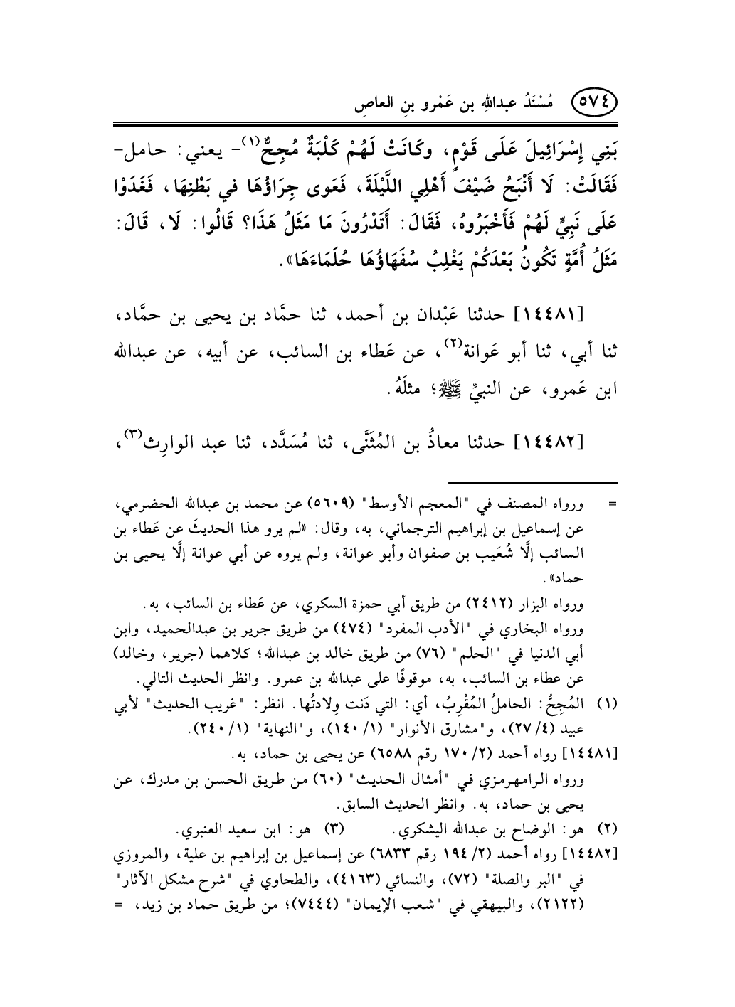14481 - حدثنا عَبْدان بن أحمد، ثنا حمَّاد بن يحيى بن حمَّاد، ثنا أبي، ثنا أبو عَوانة (¬1) ، عن عَطاء بن السائب، عن أبيه، عن عبد الله ابن عَمرو، عن النبيِّ صلى الله عليه وسلم؛ مثلَهُ.