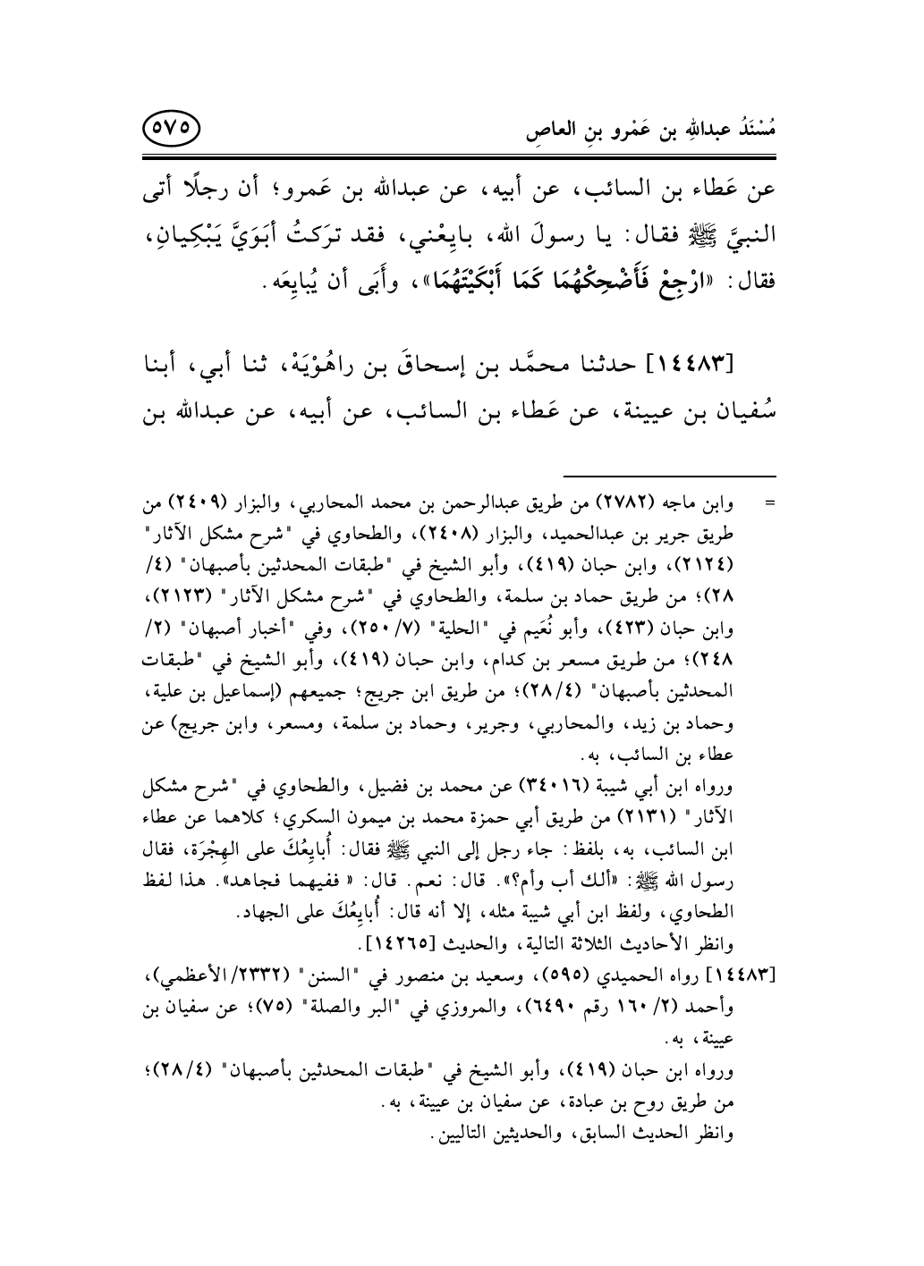 14483 - حدثنا محمَّد بن إسحاقَ بن راهُوْيَهْ، ثنا أبي، أبنا سُفيان بن عيينة، عن عَطاء بن السائب، عن أبيه، عن عبد الله بن -[576]- عَمرو؛ أن رجلاً جاء إلى رسولِ الله صلى الله عليه وسلم فقال: جئتُ أُبايِعُكَ على الهِجْرَة، وترَكتُ أبَوايَ (¬1) يَبْكِيان، فقال: «ارْجِعْ إِلَيْهِمَا فَأَضْحِكْهُمَا كَمَا أَبْكَيْتَهُمَا» .