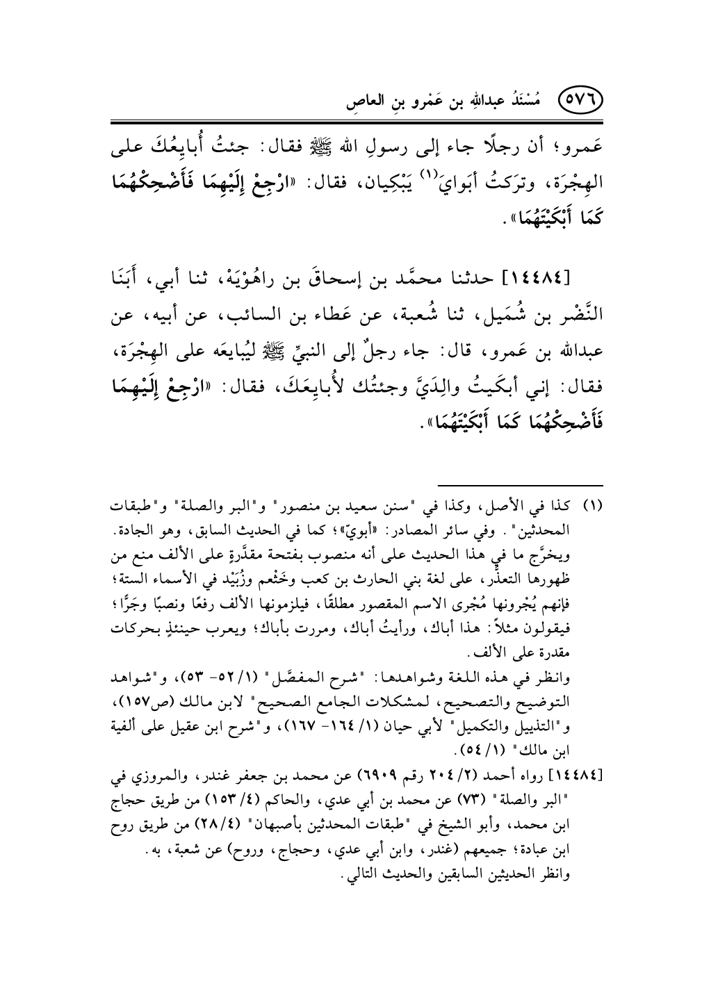 14484 - حدثنا محمَّد بن إسحاقَ بن راهُوْيَهْ، ثنا أبي، أَبَنَا النَّضْر بن شُمَيل، ثنا شُعبة، عن عَطاء بن السائب، عن أبيه، عن عبد الله بن عَمرو، قال: جاء رجلٌ إلى النبيِّ صلى الله عليه وسلم ليُبايعَه على الهِجْرَة، فقال: إني أبكَيتُ والِدَيَّ وجئتُك لأُبايِعَكَ، فقال: «ارْجِعْ إِلَيْهِمَا فَأَضْحِكْهُمَا كَمَا أَبْكَيْتَهُمَا» .
