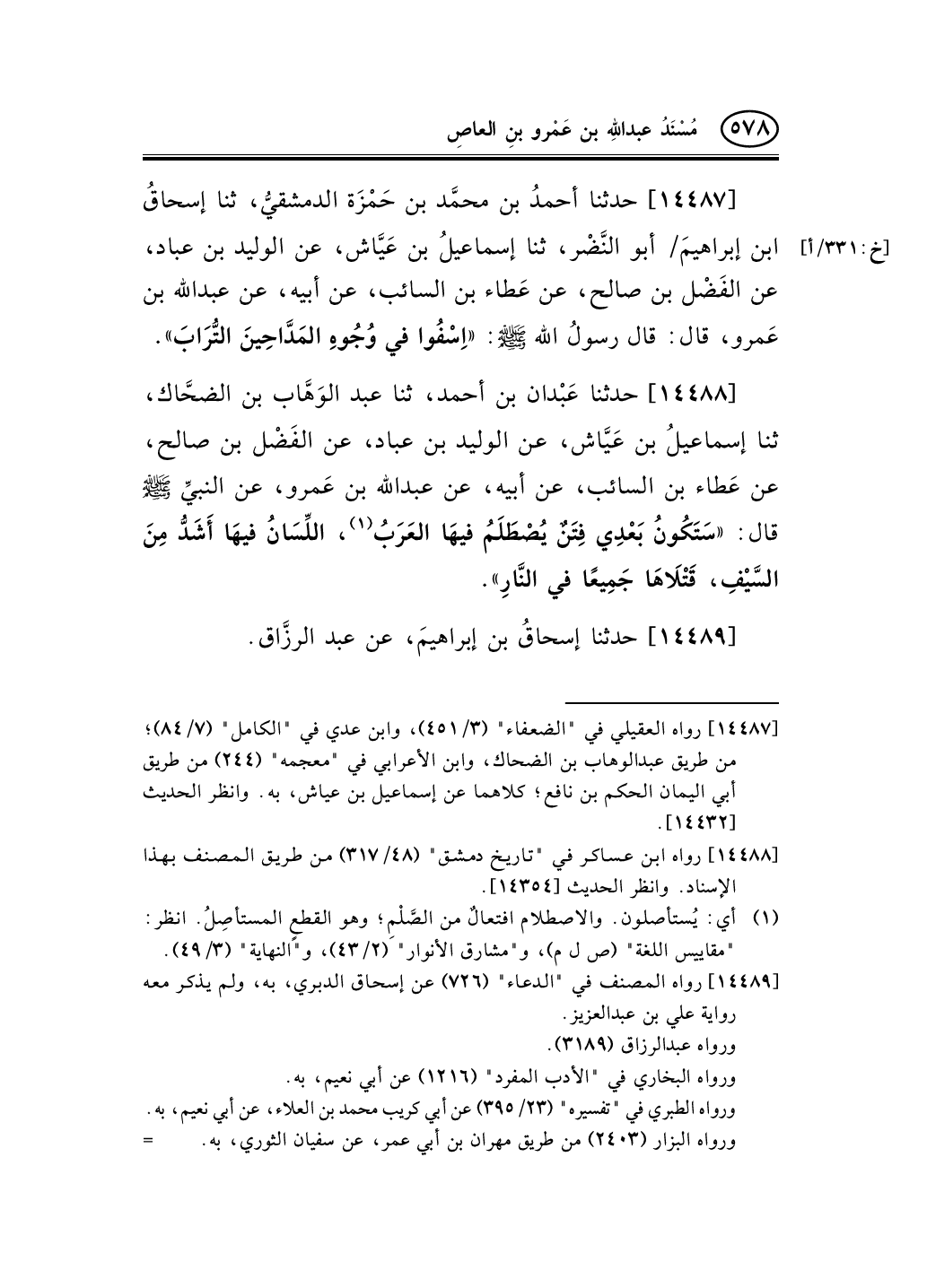 14488 - حدثنا عَبْدان بن أحمد، ثنا عبد الوَهَّاب بن الضحَّاك، ثنا إسماعيلُ بن عَيَّاش، عن الوليد بن عباد، عن الفَضْل بن صالح، عن عَطاء بن السائب، عن أبيه، عن عبد الله بن عَمرو، عن النبيِّ صلى الله عليه وسلم قال: «سَتَكُونُ بَعْدِي فِتَنٌ يُصْطَلَمُ فيهَا العَرَبُ (¬1) ، اللِّسَانُ فيهَا أَشَدُّ مِنَ السَّيْفِ، قَتْلاَهَا جَمِيعًا في النَّارِ» .
