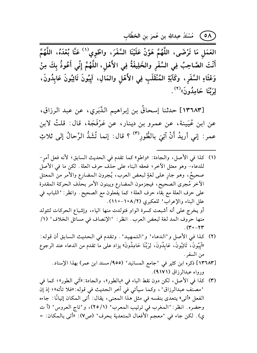 13683 - حدثنا إسحاقُ بن إبراهيم الدَّبَري، عن عبد الرزاق، عن ابن عُيَينة، عن عمرو بن دينار، عن عَرْفَجَة، قال: قلتُ لابن عمر: إني أريدُ أَنْ آتِيَ بالطُّورِ (¬1) ؟ قال: إنما تُشَدُّ الرِّحالُ إلى ثلاثِ -[59]- مساجدَ (¬2) : مسجدِ الحَرام (¬*) ، ومسجدِ رسولِ الله، ومسجدِ الأقصى (¬*) ، ودَعِ الطُّورَ فلا تأتِهِ.