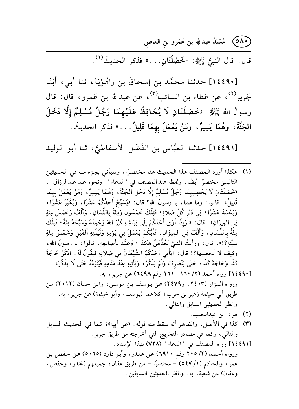 14490 - حدثنا محمَّد بن إسحاقَ بن راهُوْيَهْ، ثنا أبي، أَبَنَا جَرير (¬1) ، عن عَطاء بن السائب (¬2) ، عن عبد الله بن عَمرو، قال: قال رسولُ الله صلى الله عليه وسلم: «خَصْلَتَانِ لاَ يُحَافِظُ عَلَيْهِمَا رَجُلٌ مُسْلِمٌ إِلاَّ دَخَلَ الجَنَّةَ، وهُمَا يَسِيرٌ، ومَنْ يَعْمَلُ بِهِمَا قَلِيلٌ ... » فذكر الحديثَ.