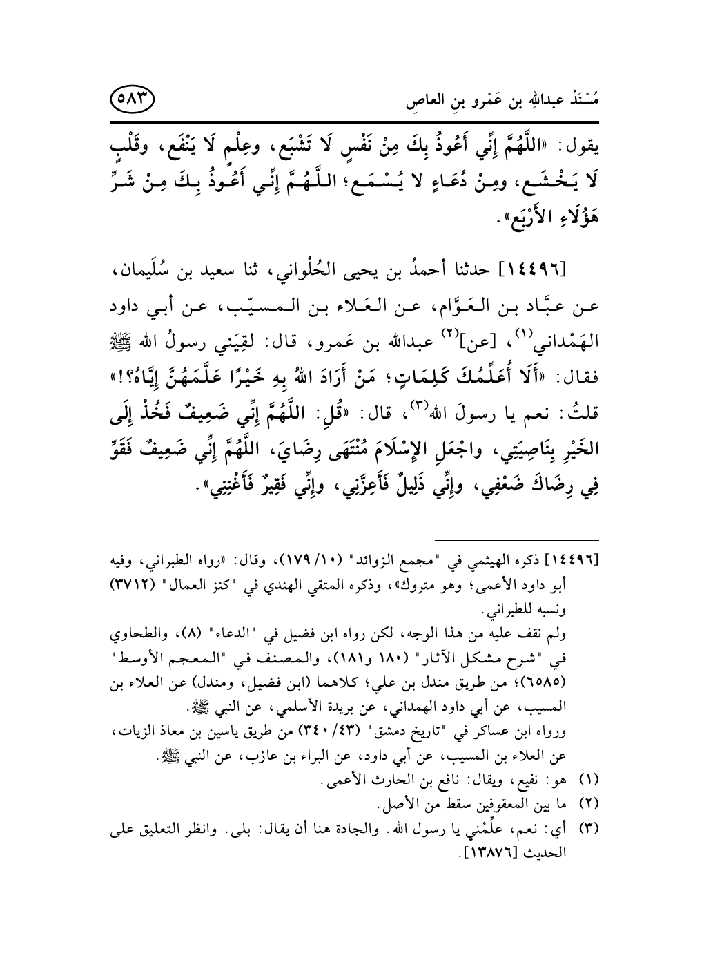 14496 - حدثنا أحمدُ بن يحيى الحُلْواني، ثنا سعيد بن سُلَيمان، عن عبَّاد بن العَوَّام، عن العَلاء بن المسيّب، عن أبي داود الهَمْداني (¬1) ، [عن] (¬2) عبد الله بن عَمرو، قال: لقِيَني رسولُ الله صلى الله عليه وسلم فقال: «أَلاَ أُعَلِّمُكَ كَلِمَاتٍ؛ مَنْ أَرَادَ اللهُ بِهِ خَيْرًا عَلَّمَهُنَّ إِيَّاهُ؟!» قلتُ: نعم يا رسولَ الله (¬3) ، قال: «قُلِ: اللَّهُمَّ إِنِّي ضَعِيفٌ فَخُذْ إِلَى الخَيْرِ بِنَاصِيَتِي، واجْعَلِ الإِسْلاَمَ مُنْتَهَى رِضَايَ، اللَّهُمَّ إِنِّي ضَعِيفٌ فَقَوِّ فِي رِضَاكَ ضَعْفِي، وإِنِّي ذَلِيلٌ فَأَعِزَّنِي، وإِنِّي فَقِيرٌ فَأَغْنِنِي» .