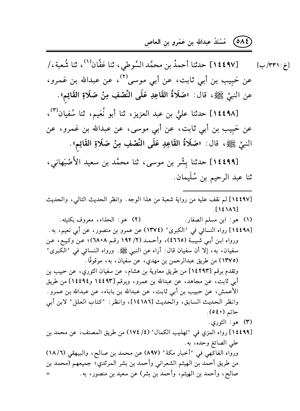 14497 - حدثنا أحمدُ بن محمَّد السَّوطي، ثنا عَفَّان (¬1) ، ثنا شُعبة، / عن حَبِيب بن أبي ثابت، عن أبي موسى (¬2) ، عن عبد الله بن عَمرو، عن النبيِّ صلى الله عليه وسلم، قال: «صَلاَةُ القَاعِدِ عَلَى النِّصْفِ مِنْ صَلاَةِ القَائِمِ» .