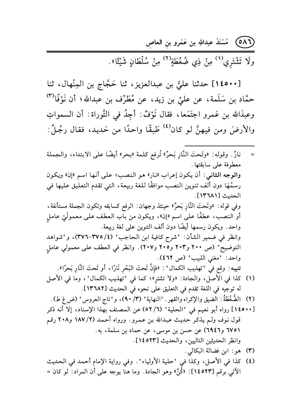 14500 - حدثنا عليُّ بن عبد العزيز، ثنا حَجَّاج بن المِنْهال، ثنا حمَّاد بن سَلَمة، عن عليِّ بن زيد، عن مُطَرِّف بن عبد الله؛ أن نَوْفًا (¬1) وعبدَالله بن عَمرو اجتَمَعا، فقال نَوْفٌ: أجِدُ في التَّوراة: أن السمواتِ والأرضَ ومن فيهنَّ لو كان (¬2) طَبقًا واحدًا من حَديد، فقال رجُلٌ: -[587]- "لا إلَهَ إلاَّ الله"، لخَرَقَتْهُنَّ حتى تنتهيَ إلى الله. فقال عبدُالله: وأنا أحدِّثُكَ عن رسول الله صلى الله عليه وسلم: صلَّينا معه العِشاءَ (¬3) ذات ليلةٍ، فرَجَع مَنْ رَجَع، وعَقَّبَ من عَقَّبَ (¬4) ، فجاءَ قبل أن يُثَوِّبَ الناسُ من صلاةِ العِشاء (¬5) وقد حَفَزَهُ النَّفَسُ (¬6) ، وقد عَقَدَ عِشْرينَ (¬7) ، وأشار بالسَّبَّابة، وهو يقولُ: «إِنَّ رَبَّكُمْ عَزَّ وجَلَّ فَتَحَ بَابًا مِنْ أَبْوَابِ السَّمَاءِ، يُبَاهِي بِكُمُ المَلاَئِكَةَ، وزَادَ (¬8) : هَؤُلاَءِ عِبَادِي قَدْ قَضَوْا فَرِيضَةً، ويَنْتَظِرُونَ أُخْرَى» .