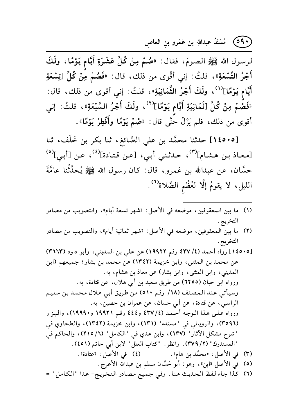 14505 - حدثنا محمَّد بن علي الصَّائغ، ثنا بكر بن خَلَف، ثنا [معاذ بن هشام] (¬1) ، حدثني أبي، [عن قتادة] (¬2) ، عن [أبي] (¬3) حسَّان، عن عبد الله بن عَمرو، قال: كان رسول الله صلى الله عليه وسلم يُحدِّثُنا عامَّةَ الليل، لا يقومُ إلاَّ لعُظْمِ الصَّلاة (¬4) .
